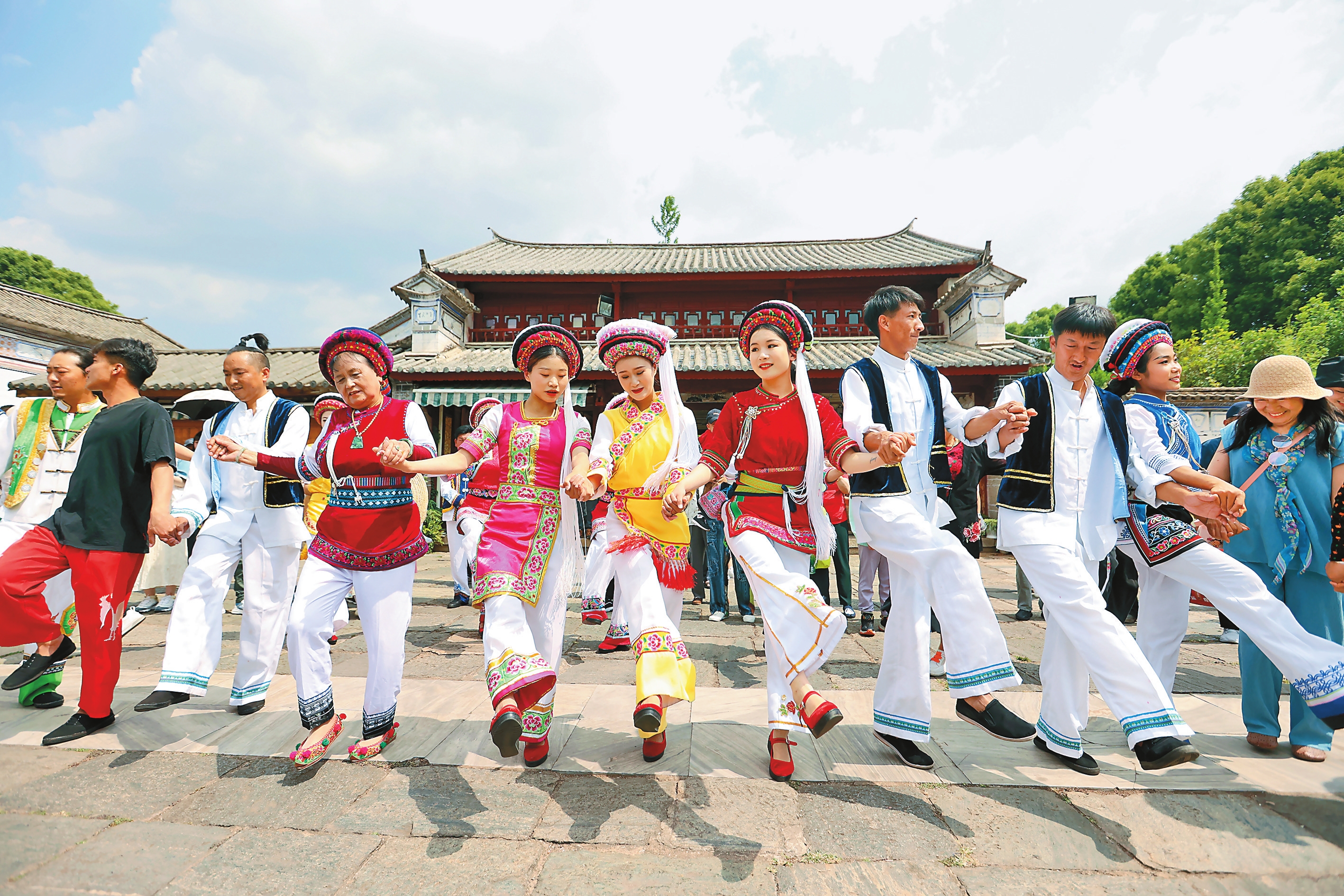 欢乐打跳 “五一”期间,云南民族村举办以“绕三灵民俗活动”为主题的白族民俗会系列活动,邀请广大游客欢聚民族村,体验白族文化展示、绕三灵巡游、三道茶体验等,活动将持续至5月5日。图为大家在欢乐打跳。本报记者 陈飞 实习生 门世辉 摄