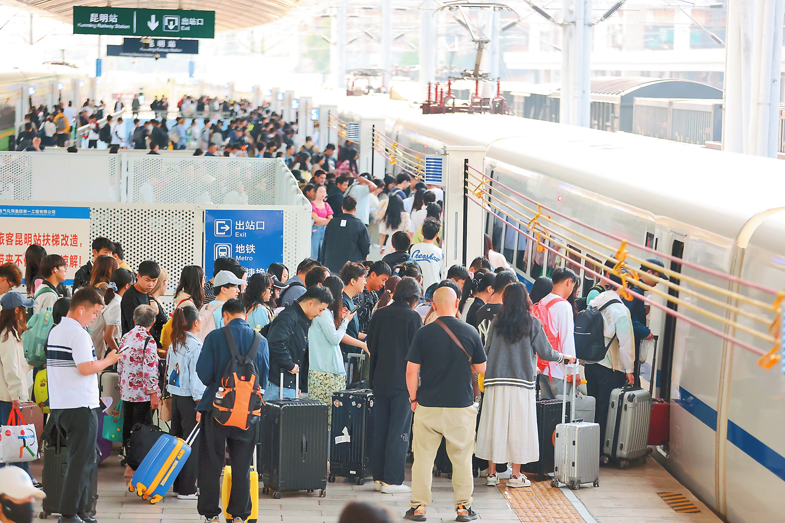 “五一”假期来临,铁路迎来客流高峰。铁路“五一”假期运输时间为4月29日至5月6日,共8天。国铁昆明局将实行高峰列车运行图,预计发送旅客312万人次,日均发送旅客39万人次。图为4月30日,旅客在昆明火车站有序进站乘车。
