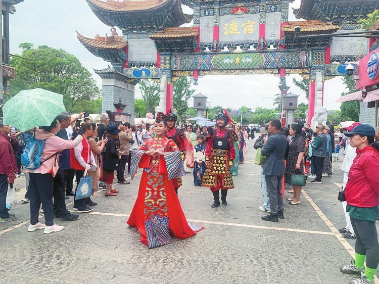 看汉服古装表演、品老昆明味道,感受古滇文化……5月1日,昆明官渡古镇游人如织,一场盛大的旗袍汉服巡游活动吸引游客纷纷驻足观赏。“在官渡古镇,真可以感受到古滇文化。”来自江苏无锡的熊小娟女士一家,拉着行李箱直接从机场奔赴这里。