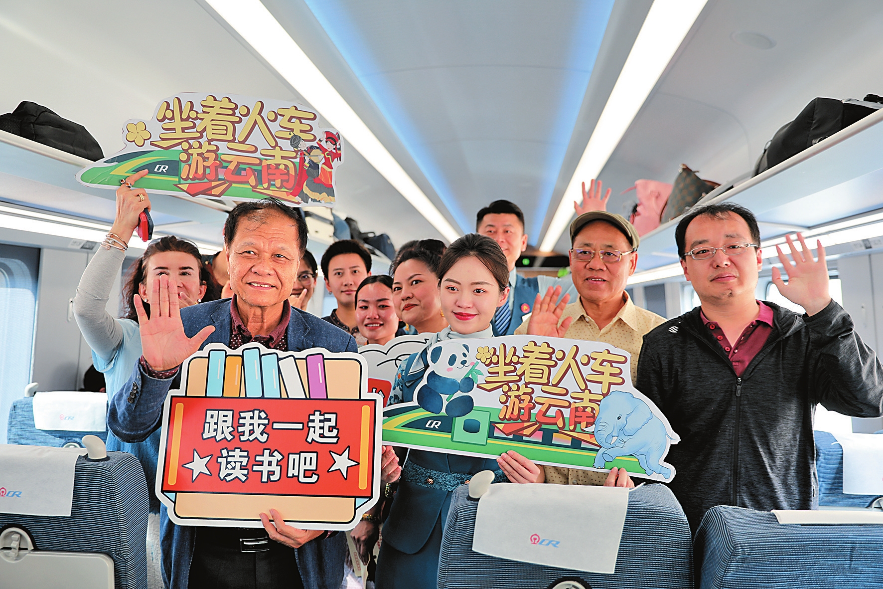 4月25日,参加老挝记者研修班的老挝朋友们在中老铁路列车上,阅读老挝语《占芭》杂志,分享生活方式,品味书香列车。