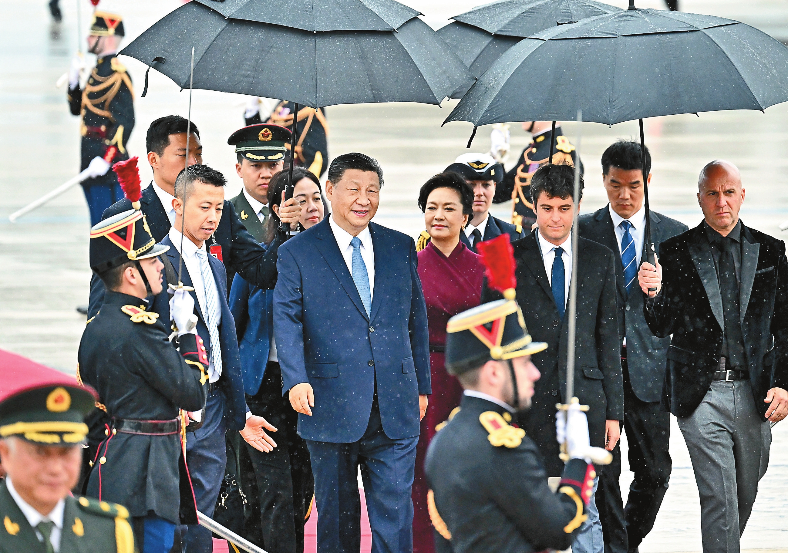 习近平乘坐专机抵达巴黎奥利机场时,法国总理阿塔尔等法国政府高级代表热情迎接。