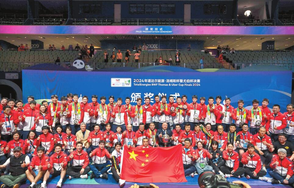 据新华社成都5月5日电(记者 田光雨 许仕豪 陈地) 2024年汤姆斯杯暨尤伯杯赛5日在成都决出冠军。国羽男、女队均在决赛中战胜印度尼西亚队,一雪上届赛事痛失双杯之耻,夺得中国队历史上第11座汤姆斯杯和第16座尤伯杯,也是时隔12年再度包揽汤尤杯。