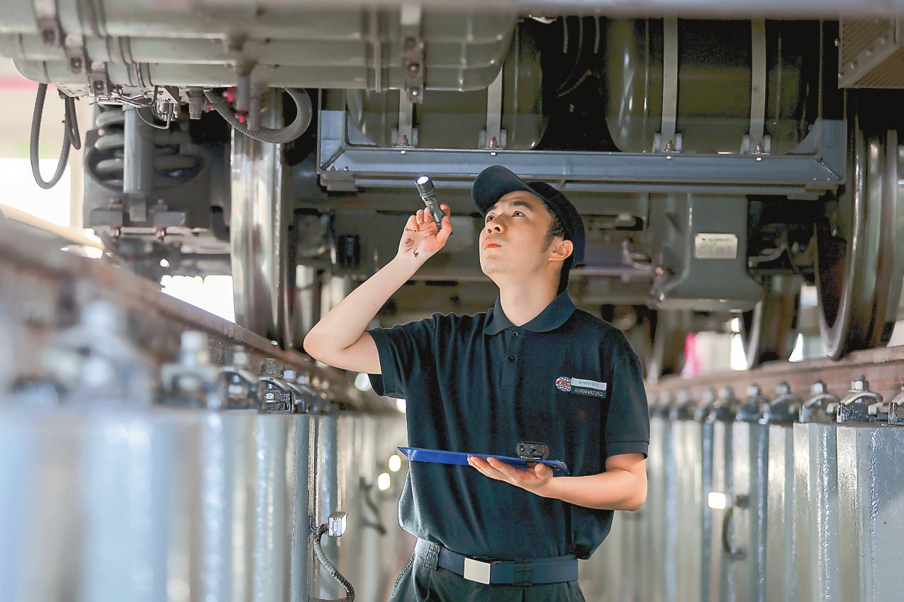“五一”假期,昆明地铁运营有限公司工作人员坚守在各自工作岗位上,用专业的态度和高度的责任心确保城市交通“大动脉”地铁安全有序运营,为广大乘客安全、舒适、高效出行保驾护航。 图为日检班组工作人员对列车进行日检作业。