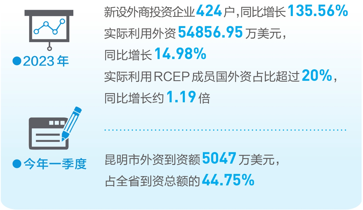 今年一季度,昆明市外资到资额5047万美元,占全省到资总额的44.75%,昆明成为外商投资兴业的热土,以高水平对外开放助力全省利用外资高质量发展。