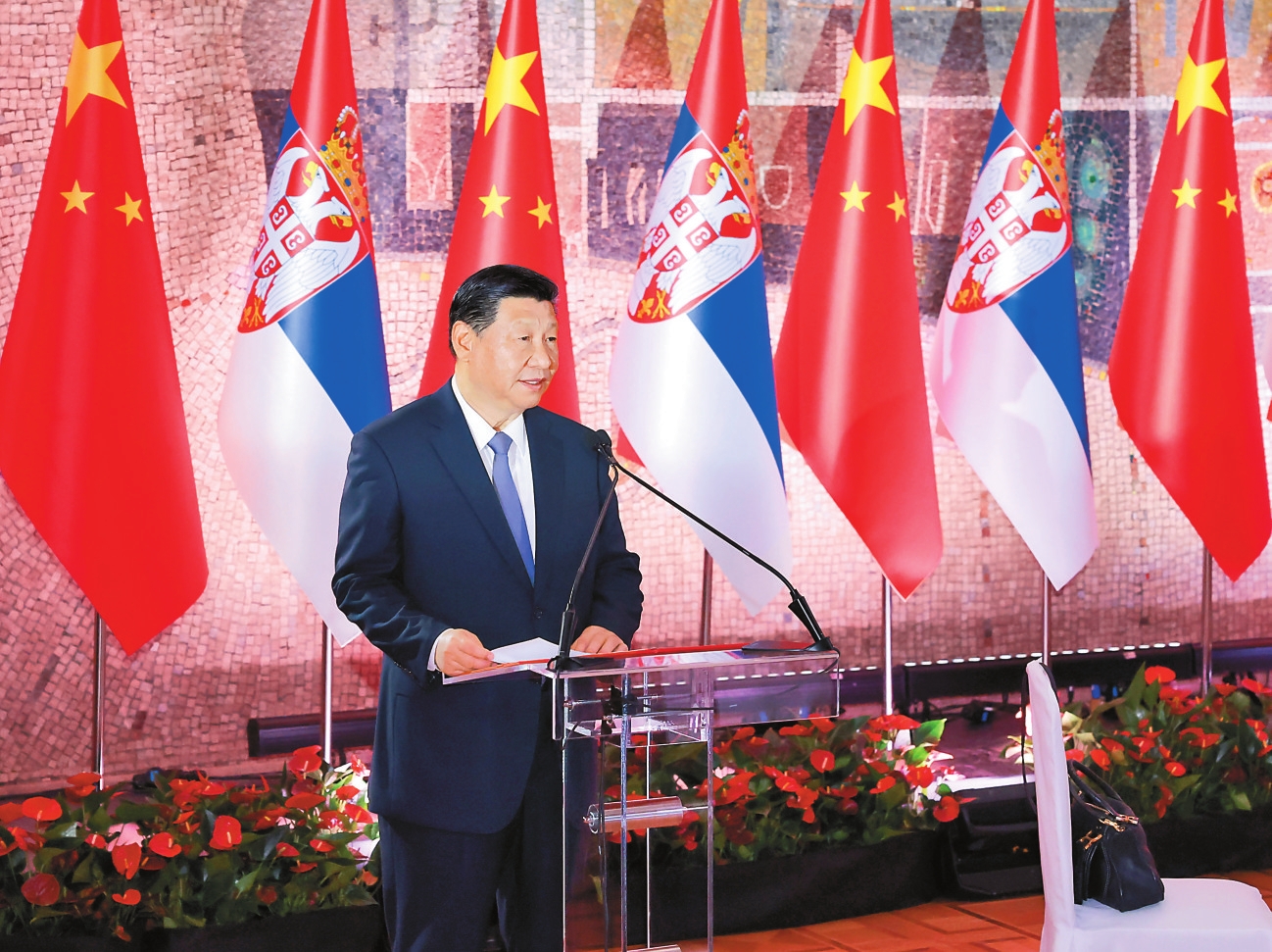 当地时间5月8日中午,国家主席习近平和夫人彭丽媛出席塞尔维亚总统武契奇和夫人在贝尔格莱德塞尔维亚大厦举行的欢迎宴会。这是习近平发表祝酒辞。新华社记者 庞兴雷 摄