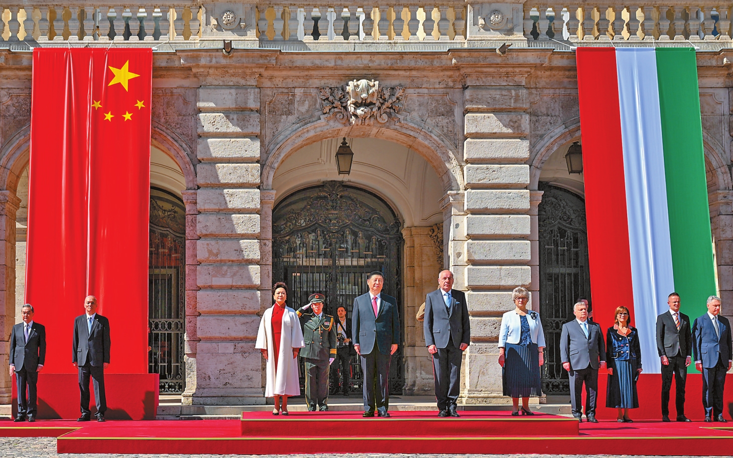 初夏时节的布达佩斯阳光明媚,古老宏伟的布达王宫庄严矗立,中匈两国国旗相映成辉。
