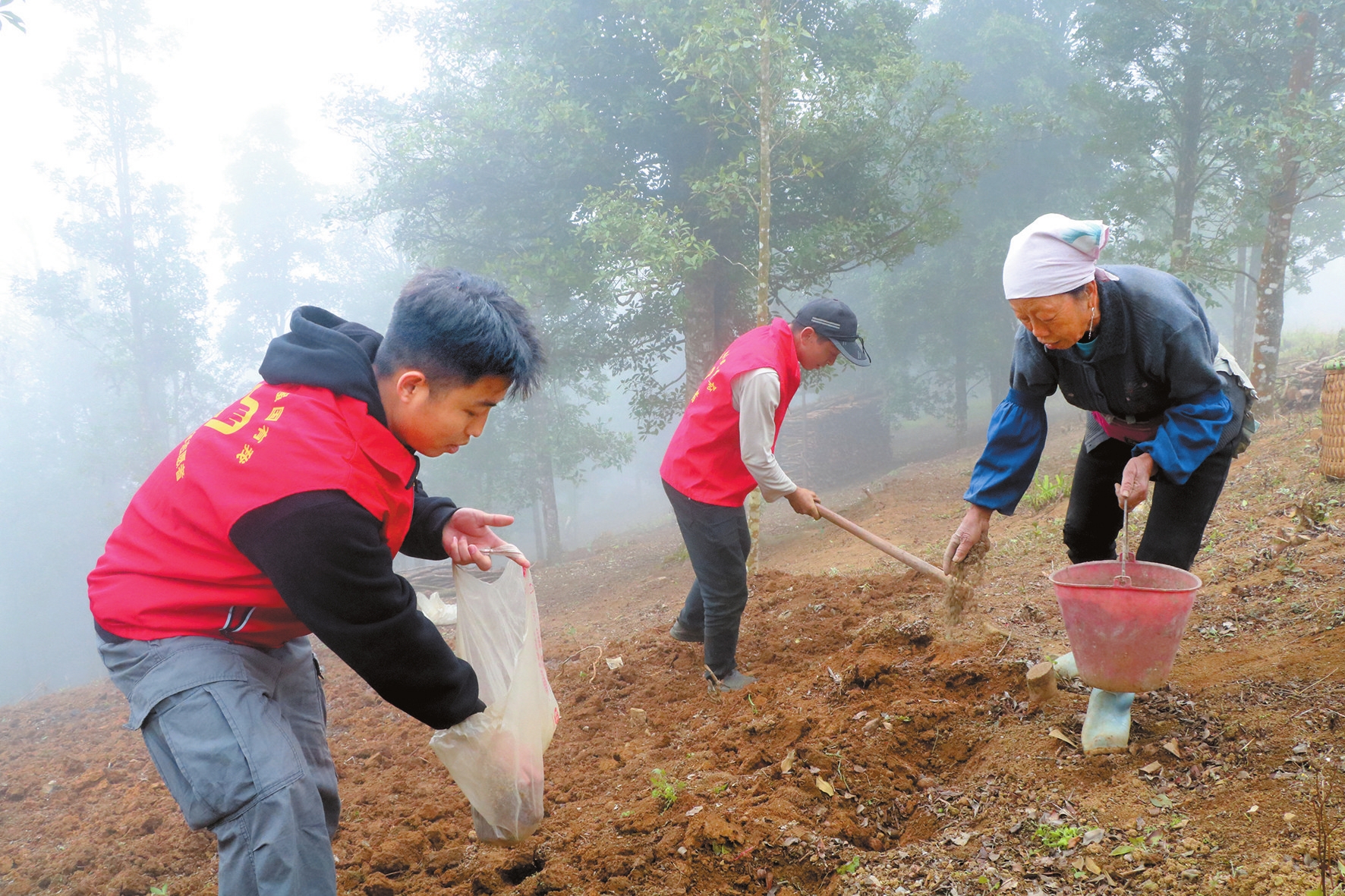 在剥隘镇者宁村,村党总支书记李炳松与村民们围坐在一起,解决土地纠纷问题。村民李某和蒙某在索炳老寨后山的茶果地,因蒙某种植茶果超过原定边界线,从而引发了矛盾。李炳松当即带队到现场查看,对当事人进行调解和劝导。面对村干部的耐心劝导,两位当事人同意在纠纷地块位置重新划定边界线。