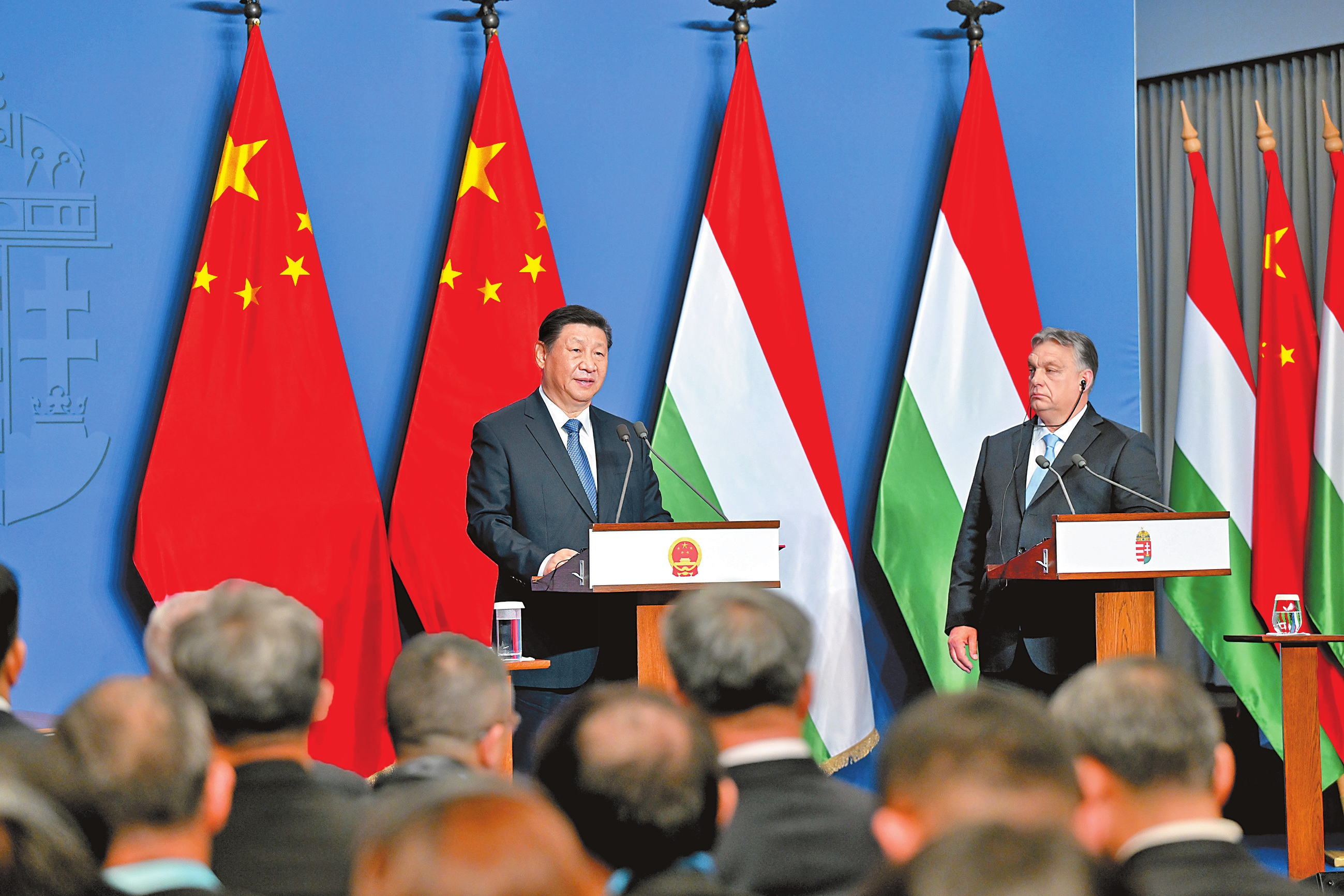 当地时间5月9日下午,国家主席习近平在布达佩斯总理府同匈牙利总理欧尔班会谈后共同会见记者。新华社记者 谢环驰 摄