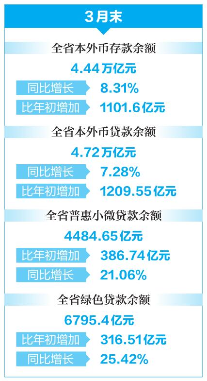 3月末,全省本外币存款余额4.44万亿元,同比增长8.31%,比年初增加1101.6亿元。全省本外币贷款余额4.72万亿元,同比增长7.28%,比年初增加1209.55亿元。