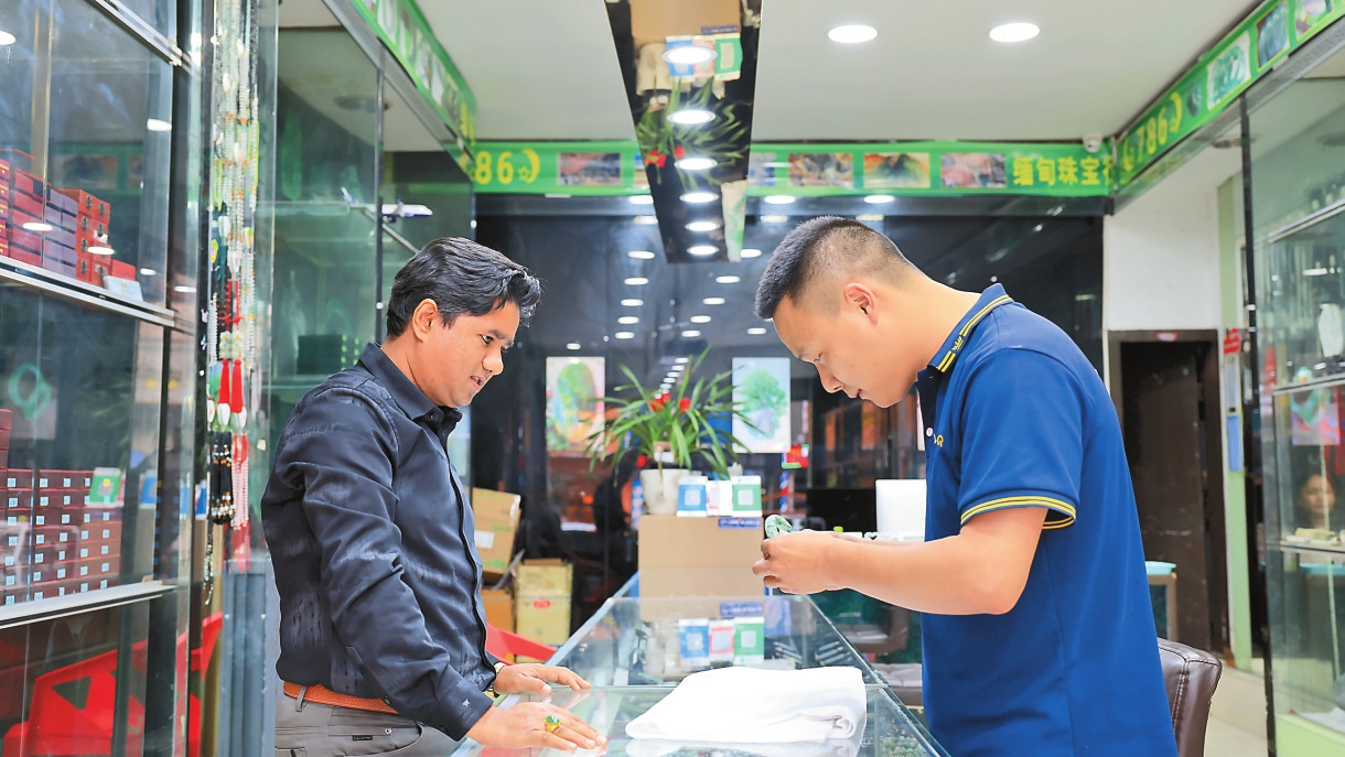 “传统款式戴着比较大气,新式的镯型会秀气一点。你们喜欢哪种?”傍晚,泸水市六库街道人民路“缅甸珠宝行”来了几位客人,店主哥哥貌用熟练的普通话为他们介绍手镯样式。