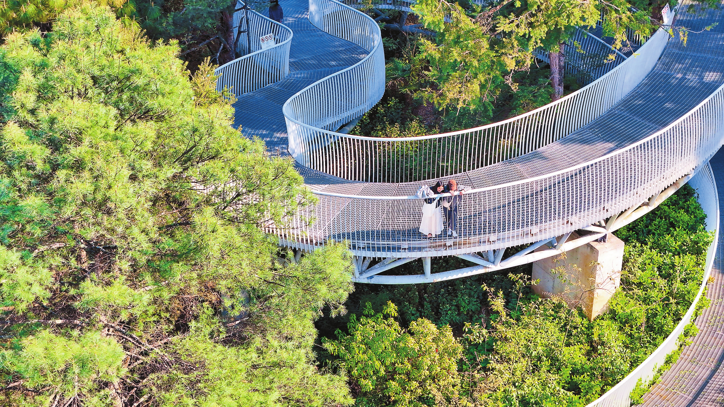 夏日初始,草木葱茏。在昆明金殿风景名胜区,白色栈道在森林中蜿蜒盘旋,吸引游人前来体验绿色“海洋”世界。昆明市盘龙区森林面积51896.37公顷,草地面积2659.85公顷,湿地面积18.67公顷。今年4月,盘龙区入选云南省林业碳汇试点县(市、区),将通过发展林业碳汇,持续培育森林后备资源,抓好碳汇试点项目建设和碳汇交易,助力协同推进降碳、减污、扩绿、增长,打造城市“绿色银行”。见习记者 高吴双 摄