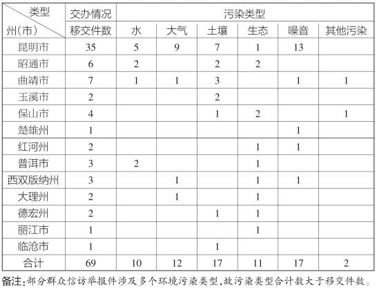 5月14日,中央第七生态环境保护督察组向云南移交第五批群众信访举报件69件,其中来电举报53件,来信举报16件。从信访举报件生态环境问题污染类型来看,涉及水10件、大气12件、土壤17件、生态11件、噪音17件,其他污染2件。从区域分布上看,昆明市35件、昭通市6件、曲靖市7件、玉溪市2件、保山市4件、楚雄州1件、红河州2件、普洱市3件、西双版纳州3件、大理州2件、德宏州2件、丽江市1件、临沧市1件。截至当日,云南省已累计收到中央第七生态环境保护督察组交办的信访举报件317件,所有举报件均已及时转交相关州(市)处理。
