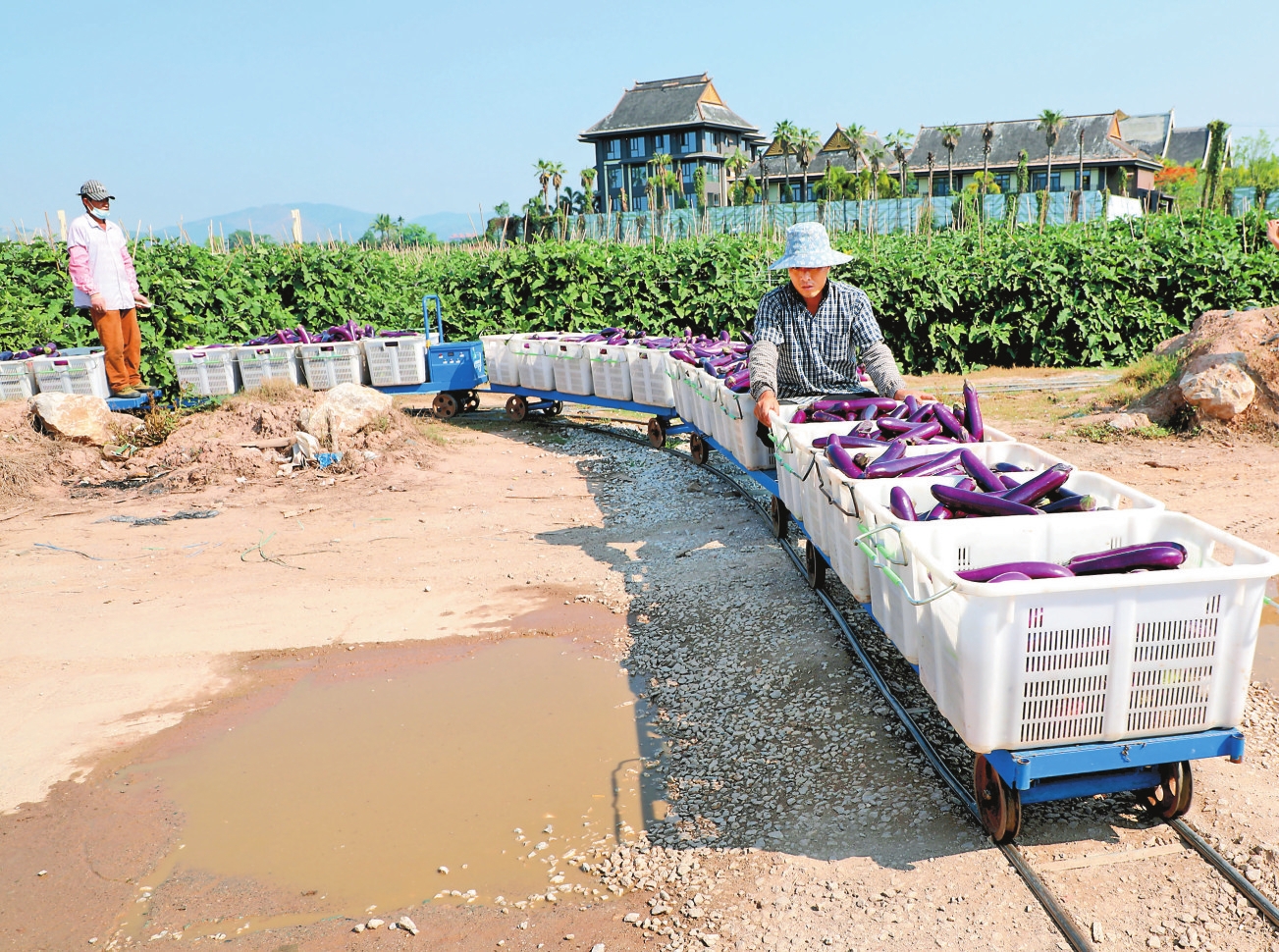 枝繁叶茂的植株上挂满如同棒槌般大小的紫红色茄子。小型铁轨铺到每个地块。工人将采摘的茄子装箱后,搬上无人小火车,然后遥控操纵小火车将数十箱茄子由地里直接运进包装车间。这是记者5月13日在景洪市景哈哈尼族乡西双版纳大洋农业科技有限公司看到的情景。除了田间跑“火车”,水肥一体化的滴灌系统和喷施农药化肥的无人机等现代农业设施也是一应俱全。