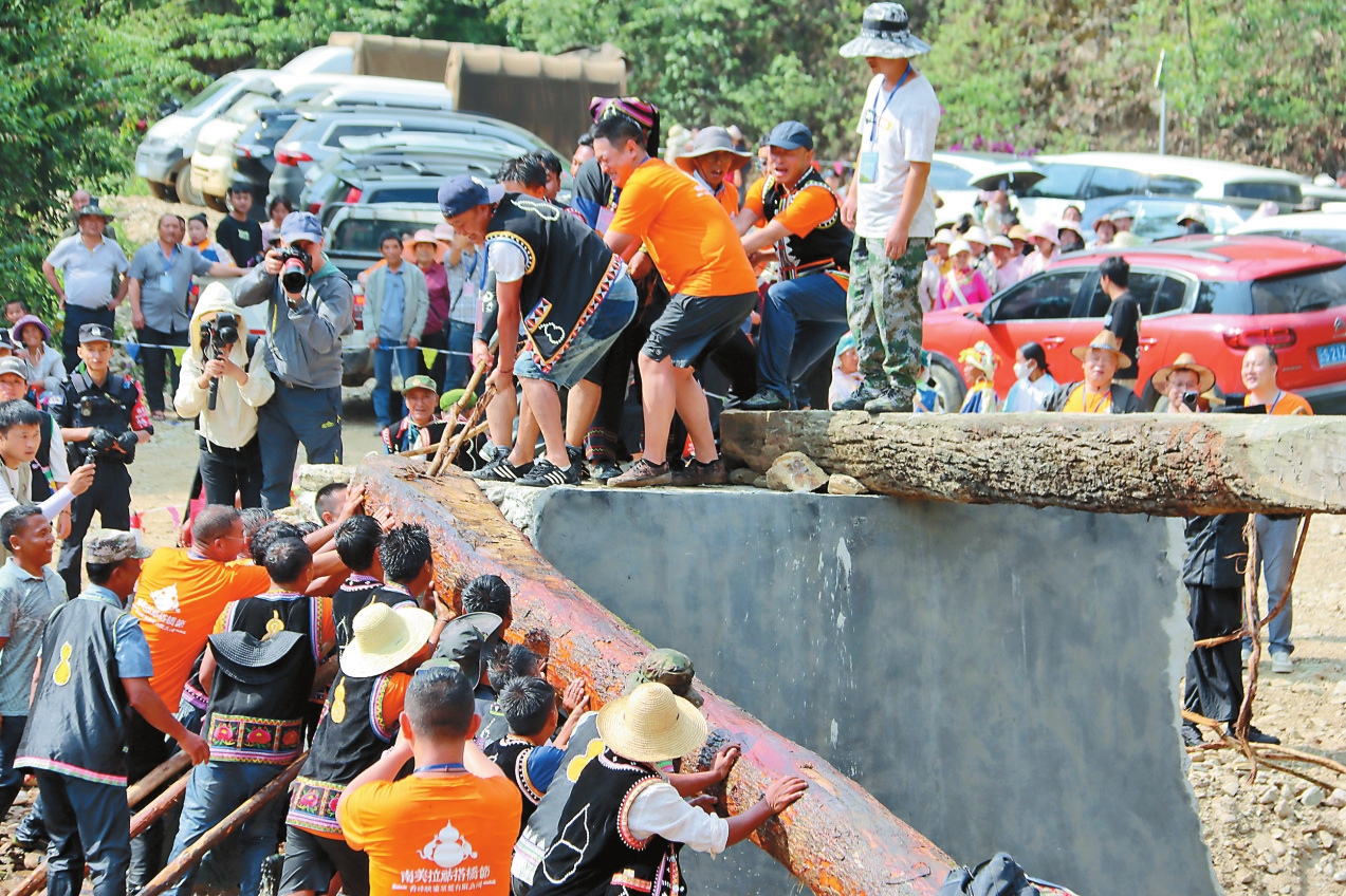 南美乡拉祜族搭桥节是我省独一无二的节日,于每年农历四月的第一个“属龙日”举办,又被拉祜族称为“毛稗魂”,是南美乡拉祜族一年中最重要的节日。节日当天,全乡拉祜族男女老少齐心协力拉着木头沿着河水顺流而下,到事先选定好的岸边徒手搭桥。之后,大家纷纷从新桥上走过,系上祈福线再捡一块石头带回家,祈盼来年风调雨顺、五谷丰登、事事顺心、家畜兴旺。