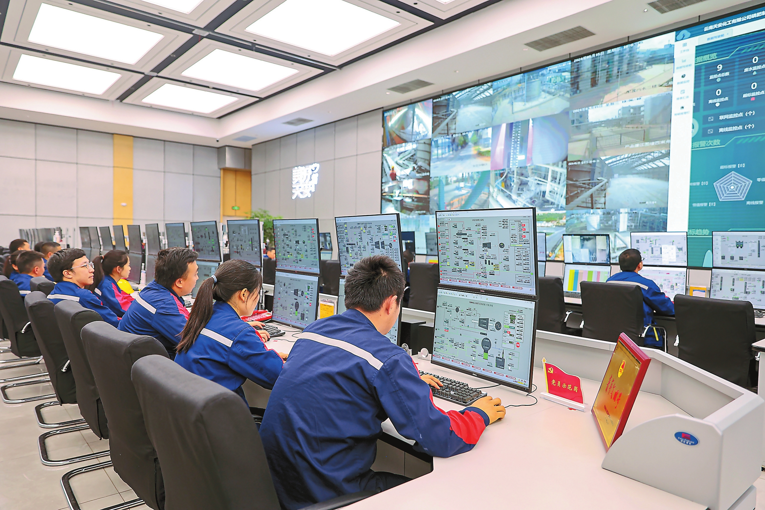 走进云天化集团所属云南天安化工有限公司,车间生产繁忙有序。在集消防、应急、综合调度于一体的智控中心里,主控人员通过电动阀、调节阀调节生产过程中的各种参数,实现20余套装置的远程控制,满足各种装置日常生产90%以上的操作。天安化工聚焦“绿色发展、双轮驱动”发展理念,不断提高大型装置自动化、智能化水平,推广先进高效产品设备,加快淘汰落后高耗能设备,实施天然气清洁能源替代项目,进行二氧化碳回收利用等,进一步降低产品能耗和碳排放强度,走出了一条智能化改造、数字化转型赋能绿色低碳发展之路。