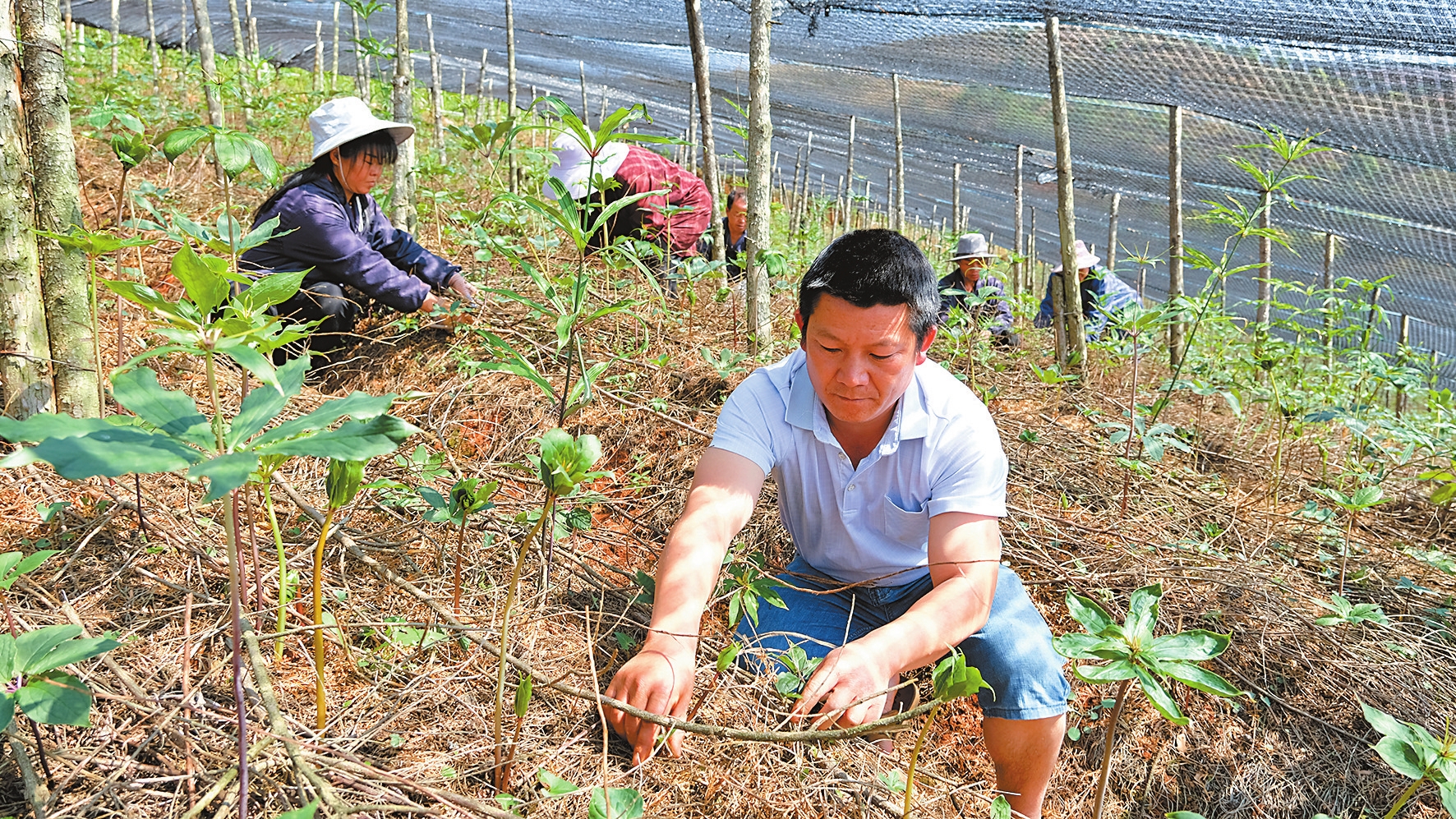 16年前,马康寿家里的18亩地流转给了当地政府引进的一家药材种植龙头企业,他和老伴也成为这个主要种植滇重楼、红豆杉、滇黄精等中药材基地的务工人员。除了流转租金与每月稳定的务工收入,最近几年,马康寿两口子又增加了一笔可观的新收入。为了留住懂技术、会管理的产业工人,龙头企业创新使用“夫妻工”,将1200亩重楼基地划分成40块小基地,承包给“夫妻工”管理。