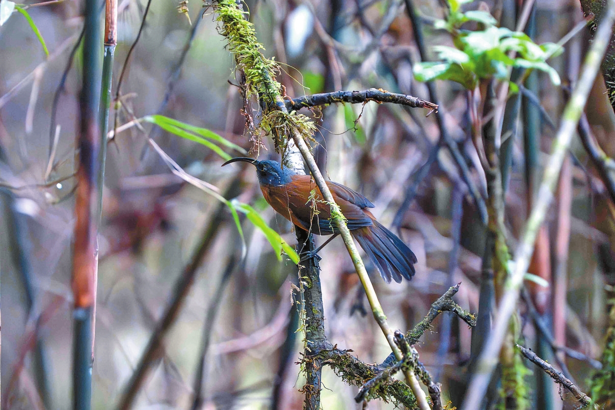 细嘴钩嘴鹛也称“剑嘴鹛”,是雀形目林鹛科钩嘴鹛属动物,目前已列入《国家保护的有重要生态、科学、社会价值的陆生野生动物名录》和云南省重点保护陆生野生动物名录(2023年)。此次共拍摄记录到的6只“细嘴钩嘴鹛”新亚种,据推测该区域应有较为稳定的种群及其数量,能多次听到其鸣叫声。