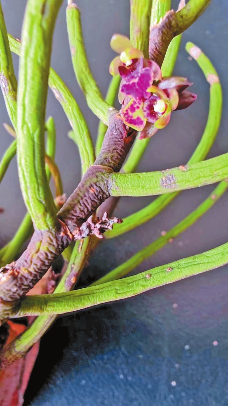 钗子股是兰科钗子股属的附生草本植物,须根发达粗壮;茎丛生,圆柱形;叶互生,排成2列,叶片圆柱形肉质,基部具筒状革质鞘;花绿色带暗紫红色,尊片和花瓣长圆形;蒴果棒状纺锤形。花期为4月至5月,果期为8月。