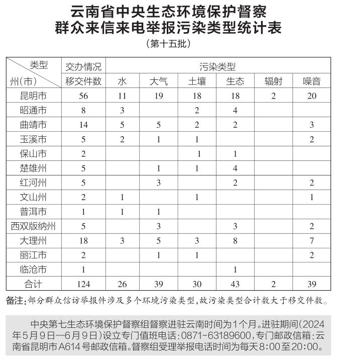 5月24日,中央第七生态环境保护督察组向云南移交第十五批群众信访举报件124件,其中来电举报57件,来信举报67件。从信访举报件生态环境问题污染类型来看,涉及水26件、大气39件、土壤30件、生态43件、辐射2件、噪音39件。从区域分布上看,昆明市56件、昭通市8件、曲靖市14件、玉溪市5件、保山市2件、楚雄州5件、红河州5件、文山州2件、普洱市1件、西双版纳州5件、大理州18件、丽江市2件、临沧市1件。截至当日,云南省已累计收到中央第七生态环境保护督察组交办的信访举报件1303件,所有举报件均已及时转交相关州(市)处理。