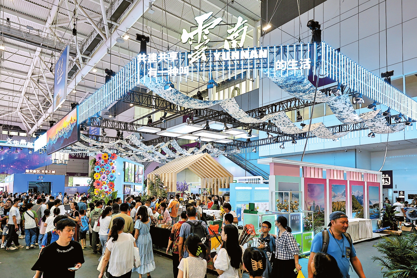 为期5天的第二十届中国(深圳)国际文化产业博览交易会5月27日落下帷幕。展会期间,云南展区亮点纷呈,现场人气爆棚、客商云集,丰富的展陈内容吸引了观众驻足。本届文博会上,云南展区通过静态展示、多媒体互动、现场演绎等形式,集中展现云南文化产业发展新亮点、新成果,向海内外人士发出“共建共享有一种叫云南的生活”的邀请函。本报记者 胡妤雅 摄