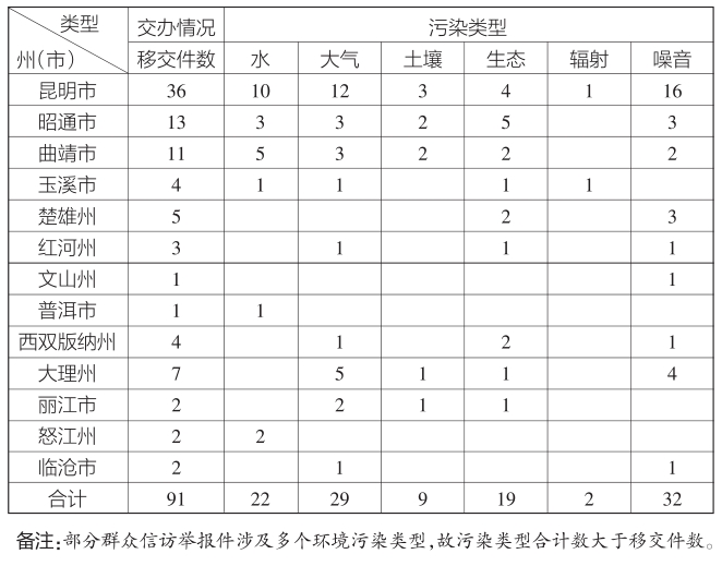 5月28日,中央第七生态环境保护督察组向云南移交第十九批群众信访举报件91件,其中来电举报64件,来信举报27件。从信访举报件生态环境问题污染类型来看,涉及水22件、大气29件、土壤9件、生态19件、辐射2件、噪音32件。从区域分布上看,昆明市36件、昭通市13件、曲靖市11件、玉溪市4件、楚雄州5件、红河州3件、文山州1件、普洱市1件、西双版纳州4件、大理州7件、丽江市2件、怒江州2件、临沧市2件。截至当日,云南省已累计收到中央第七生态环境保护督察组交办的信访举报件1732件,所有举报件均已及时转交相关州(市)处理。
