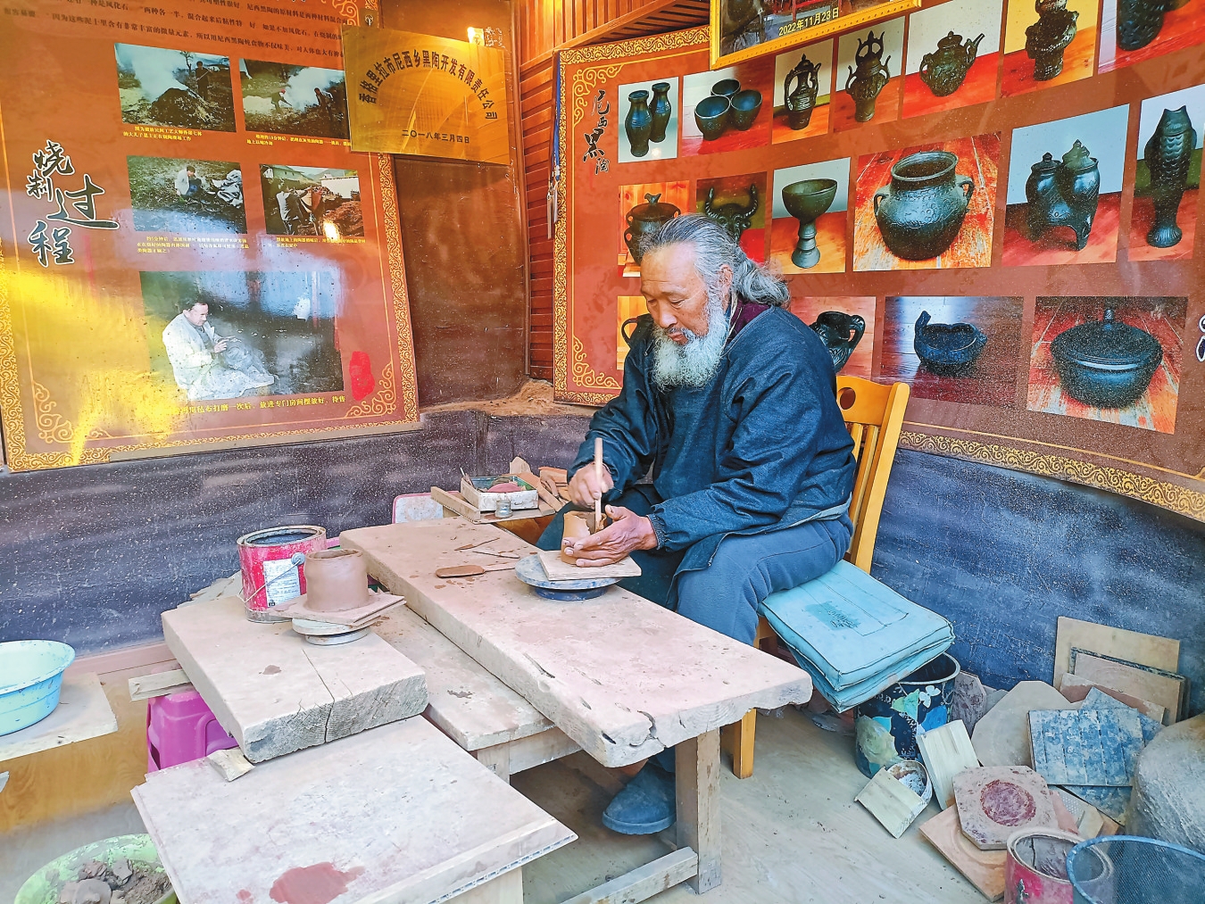 香格里拉市尼西乡汤满村村民拉茸批初是村里的致富带头人,同时也是陶器烧制技艺(藏族黑陶烧制技艺)这一国家级非遗技艺的传承人之一。他在做好传统藏族黑陶烧制技艺的同时,也积极开发黑陶的创新产品。“传统黑陶是低温陶,600多度就能烧制而成。而目前我们做出的黑陶创新产品,烧制温度需要上千度。”拉茸批初拿起一个黑陶小碗,往地上一丢,只听一声清脆的“啪”,那只小碗依然完好无损。拉茸批初说:“这就是我们黑陶的创新产品,这样摔是摔不坏的。传统的黑陶这样一摔,肯定四分五裂。创新的黑陶能做出的产品更多、适用面更广,能够带来更大的经济效益和文化影响力。”
