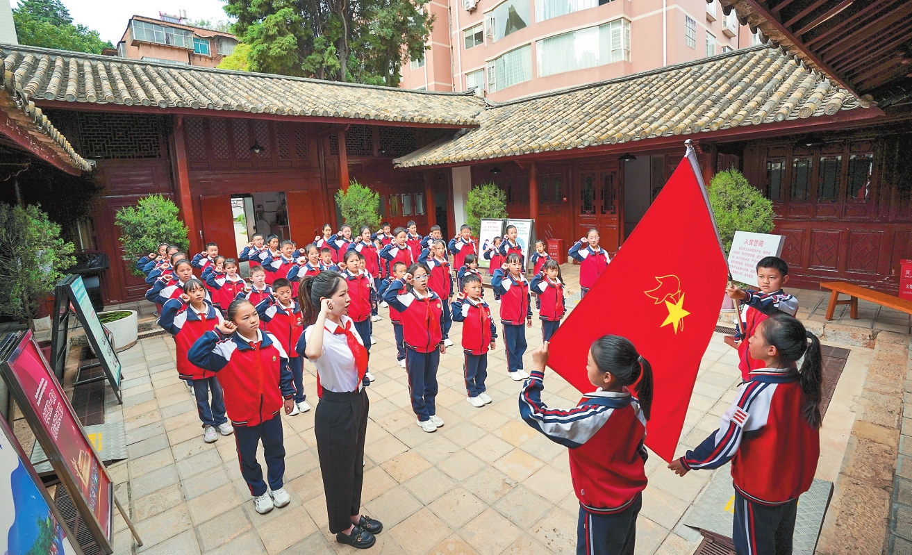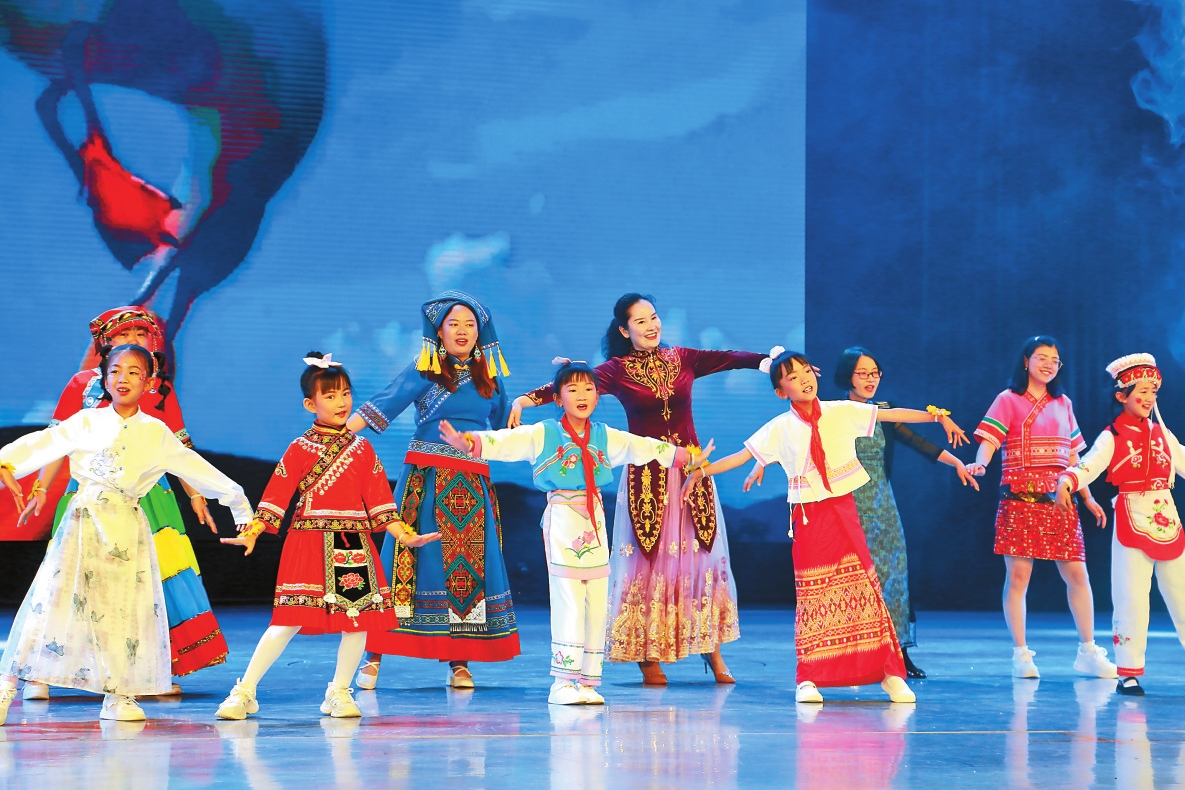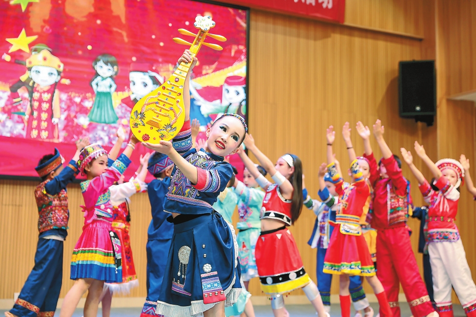 “五十六个星座五十六枝花,五十六族兄弟姐妹是一家,五十六种语言汇成一句话……”5月31日,昆明市西山区观音山中心学校举行主题为“民族团结一家亲 争做新时代好队员”的文艺汇演,以丰富多彩的歌舞表演庆祝国际儿童节。文艺汇演在阿昌族人民幸福生活的舞蹈《漫色户撒》中拉开序幕,《石榴籽》《红星闪闪》等节目精彩纷呈。孩子们身着各民族的传统服装,在老师的带领下,表演汉族、藏族、彝族等民族的特色舞蹈,博得了在场家长和观众的喝彩。