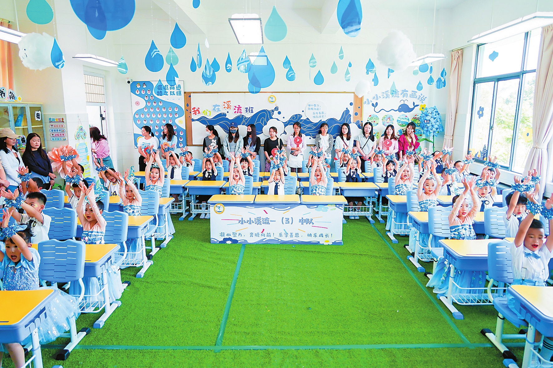 2024年5月24日,一场特别的班级文化大赛在金康园小学举行。赛前,师生就充分发挥创造力,打造出属于自己班级的口号、故事和文化墙,让学校的每一个角落都充满孩子的创意。同时,对孩子进行生命直觉引导,用美温润他们的眼睛和心灵,让想象力和创造力在艺术的光照下绽放。一朵云在成人眼中是一团水汽,在孩子眼中则是马儿、大象、城堡、亭台楼阁等。“想象力是孩子们与生俱来的能力,他们用最擅长的创作方式,完成了一个个天马行空的艺术作品,这无疑是美育艺术课的根本意义。”参加活动的老师说。正是有了这样的理念,学校的美育逐步向“育心”发展。