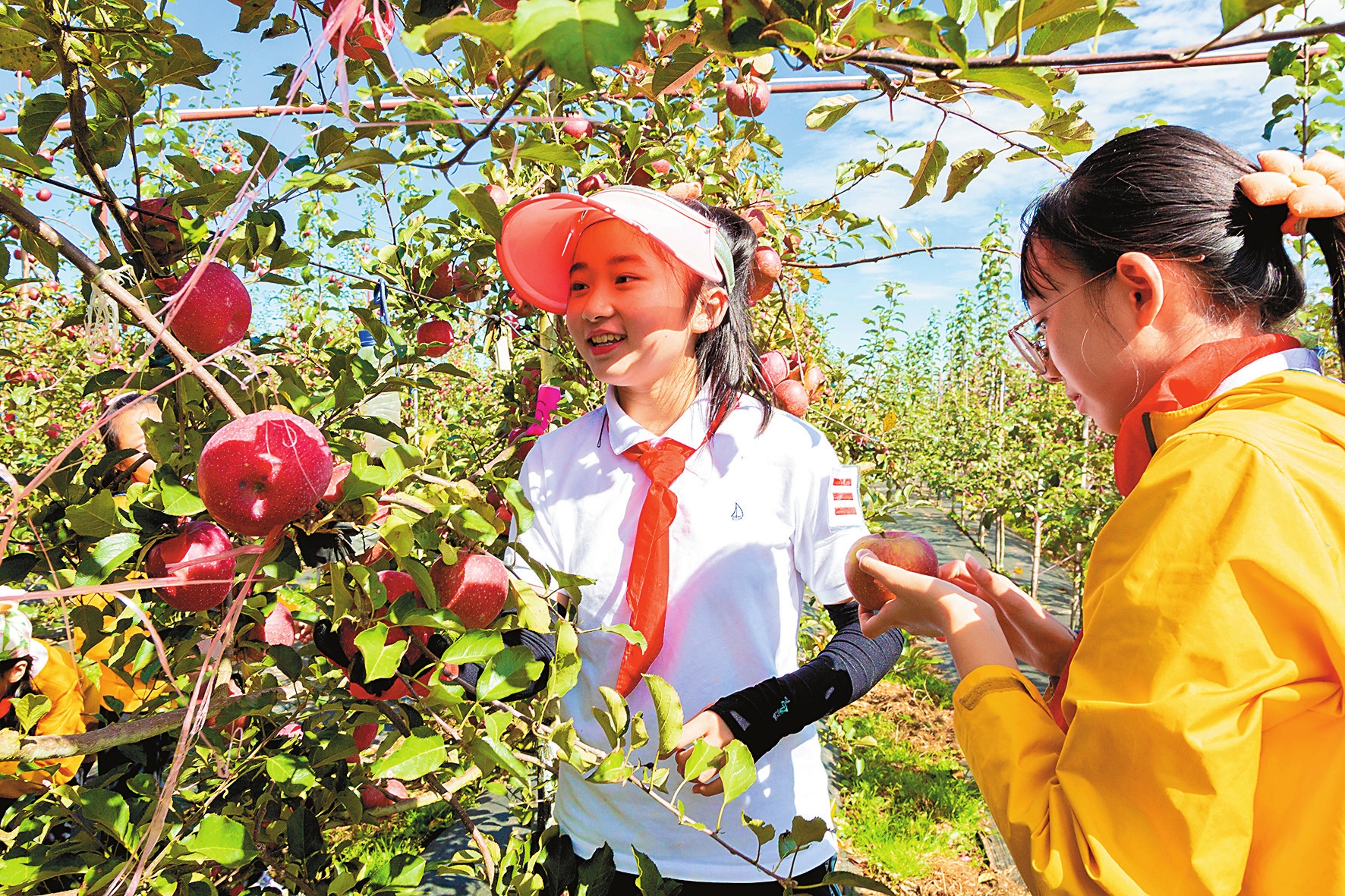 学校还积极开辟校外基地。2021年,金康园小学在团结街道鑫苹果基地的第二个户外综合实践基地正式挂牌。每年10月,学校都会带领六年级学生前往基地,开展以“‘苹’味甜蜜‘果’然有你”为主题的劳动实践活动,让学生们化身“小小果农”,开启忙碌的采摘和售卖之旅。从果树维护到采摘果实、再到售卖,学生全程参与其中,切身感受劳动的不易以及珍惜劳动成果的重要性,建立了与土地的连接,感知精彩生活。