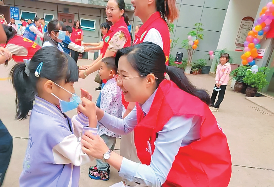 在禄丰市金山镇西门社区院坝内,30名身着红马甲的“爱心妈妈”在“小蝌蚪找妈妈”的游戏中陪伴孩子们成长,还通过阅读经典故事、一起做手工等方式,关心孩子们的心理和学习成长。在南华县东城幼儿园,11名“爱心妈妈”志愿者为39名留守儿童带来了一场特别的集体“生日会”,与孩子们一起进行了趣味游戏、手工制作和生日庆祝,让每位孩子在“生日”的这一天感受到了来自社会各界的关心和祝福。在永仁县莲池中心小学,在“爱心妈妈”的陪伴下,62名留守和困境儿童收到了被褥包,“爱心妈妈”们还详细了解了每一个孩子的学习生活情况。