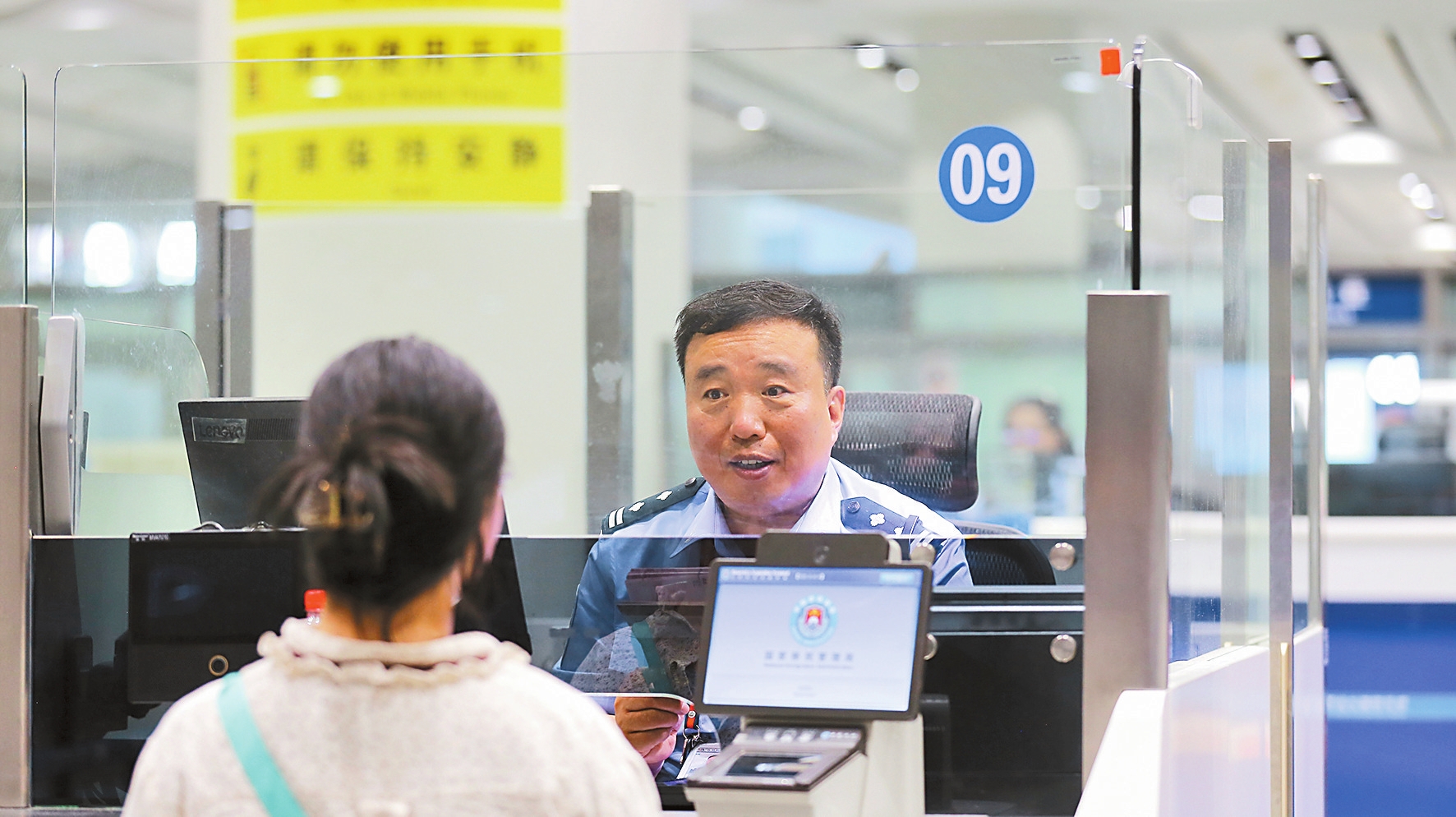 “Passport please?”昆明出入境边防检查站民警聂红涛用熟练的英语询问着准备通关的旅客。查验无误后,他盖下验讫章,放行通关,并示意下一位旅客上前。在日均出入境人员超9000人次的昆明长水国际机场口岸,聂红涛和同事日夜坚守着。