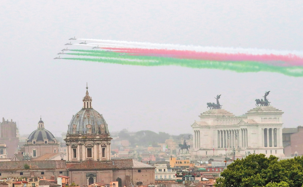 6月2日,意大利“三色箭”飞行表演队飞越意大利首都罗马上空。每年6月2日的共和国日也是意大利的国庆日。