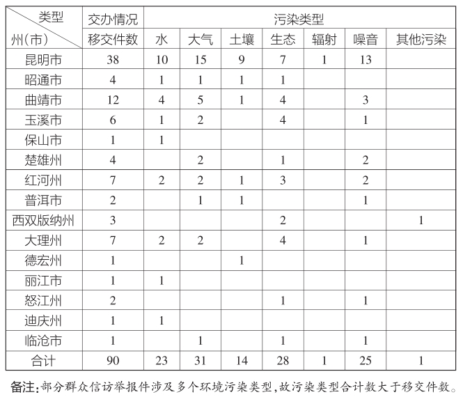 6月3日,中央第七生态环境保护督察组向云南移交第二十五批群众信访举报件90件,其中来电举报46件,来信举报44件。从信访举报件生态环境问题污染类型来看,涉及水23件、大气31件、土壤14件、生态28件、辐射1件、噪音25件、其他污染1件。从区域分布上看,昆明市38件、昭通市4件、曲靖市12件、玉溪市6件、保山市1件、楚雄州4件、红河州7件、普洱市2件、西双版纳州3件、大理州7件、德宏州1件、丽江市1件、怒江州2件、迪庆州1件、临沧市1件。截至当日,云南省已累计收到中央第七生态环境保护督察组交办的信访举报件2380件,所有举报件均已及时转交相关州(市)处理。