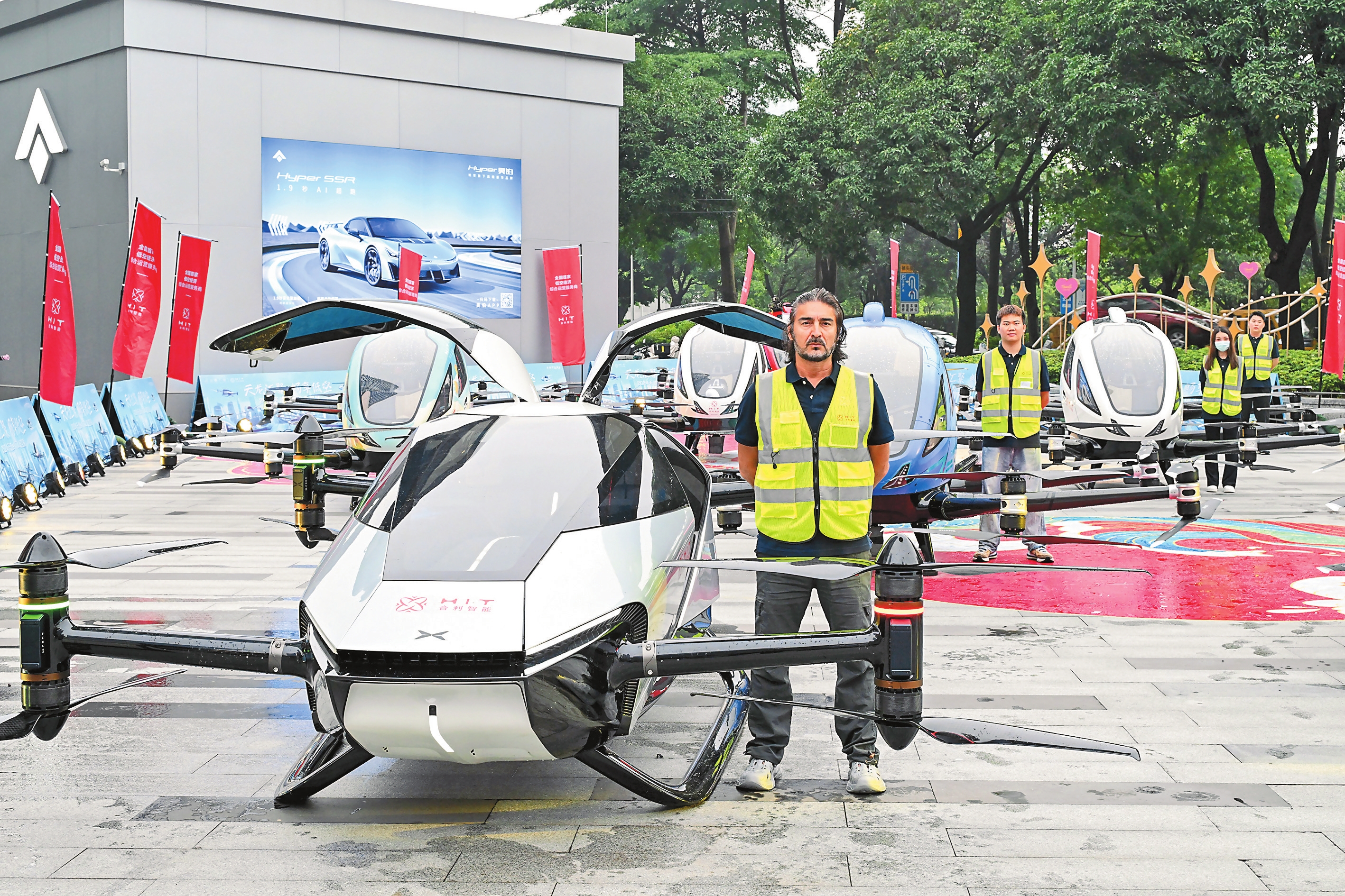 近日,一场低空航展在广州天德广场举行,十余架明星eVTOL(电动垂直起降飞行器)机型集中亮相,进行静态展示。日前广州发布《广州市低空经济发展实施方案》,本次航展是国内低空经济相关企业助力推动广州成为国内首个载人飞行商业化运营城市的积极行动。图为6月3日,广州低空航展上,eVTOL综合运营服务商合利智能的工程师团队和他们运营服务的机型。 新华社记者 刘大伟 摄