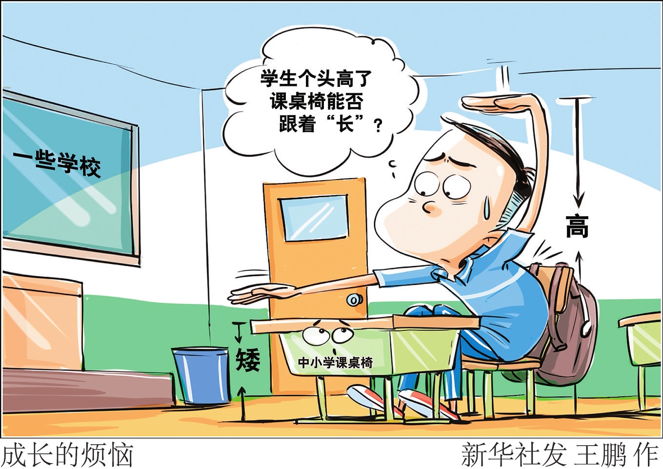 “新华视点”记者采访发现,由于课桌椅国家标准滞后等原因,不少地方存在课桌椅与学生身高不大匹配的情况;课桌椅“低配”现象,成为孩子们“成长的烦恼”,无形中增加了近视、驼背等健康隐患。