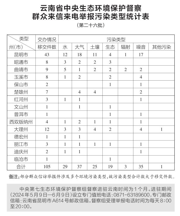 6月4日,中央第七生态环境保护督察组向云南移交第二十六批群众信访举报件105件,其中来电举报52件,来信举报53件。从信访举报件生态环境问题污染类型来看,涉及水29件、大气37件、土壤25件、生态19件、辐射3件、噪音35件、其他污染1件。从区域分布上看,昆明市43件、昭通市8件、曲靖市9件、玉溪市8件、保山市2件、楚雄州7件、红河州3件、文山州1件、普洱市1件、西双版纳州4件、大理州12件、德宏州1件、丽江市3件、迪庆州2件、临沧市1件。截至当日,云南省已累计收到中央第七生态环境保护督察组交办的信访举报件2485件,所有举报件均已及时转交相关州(市)处理。
