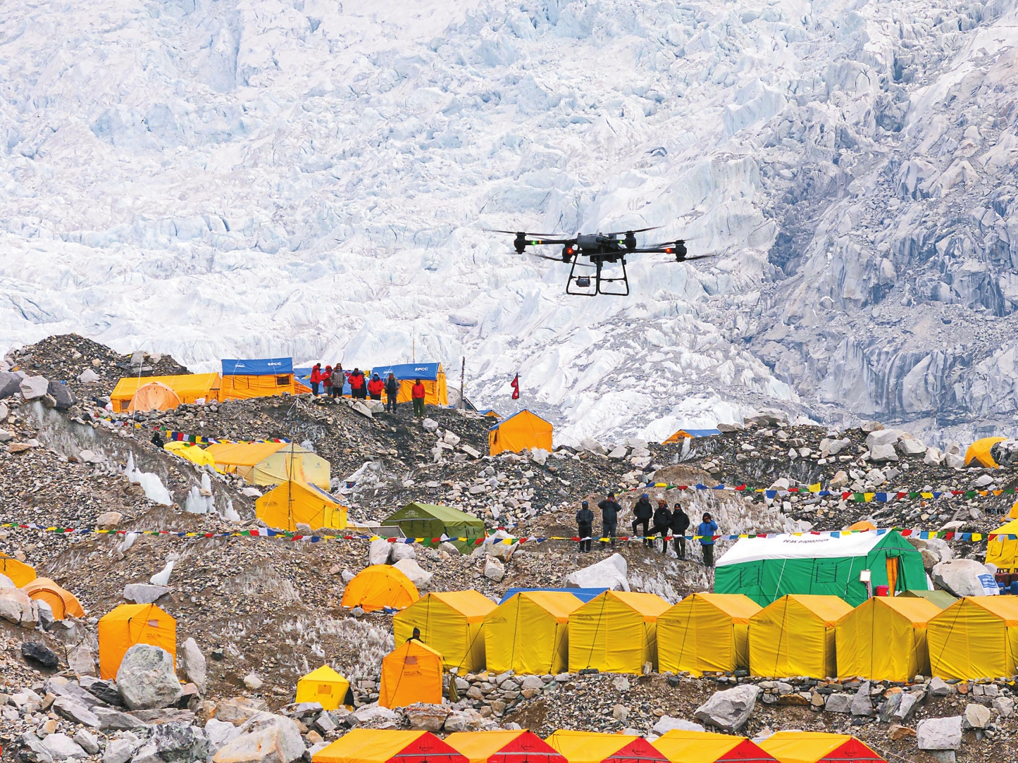 图为4月30日,大疆运载无人机从珠穆朗玛峰南坡大本营起飞。