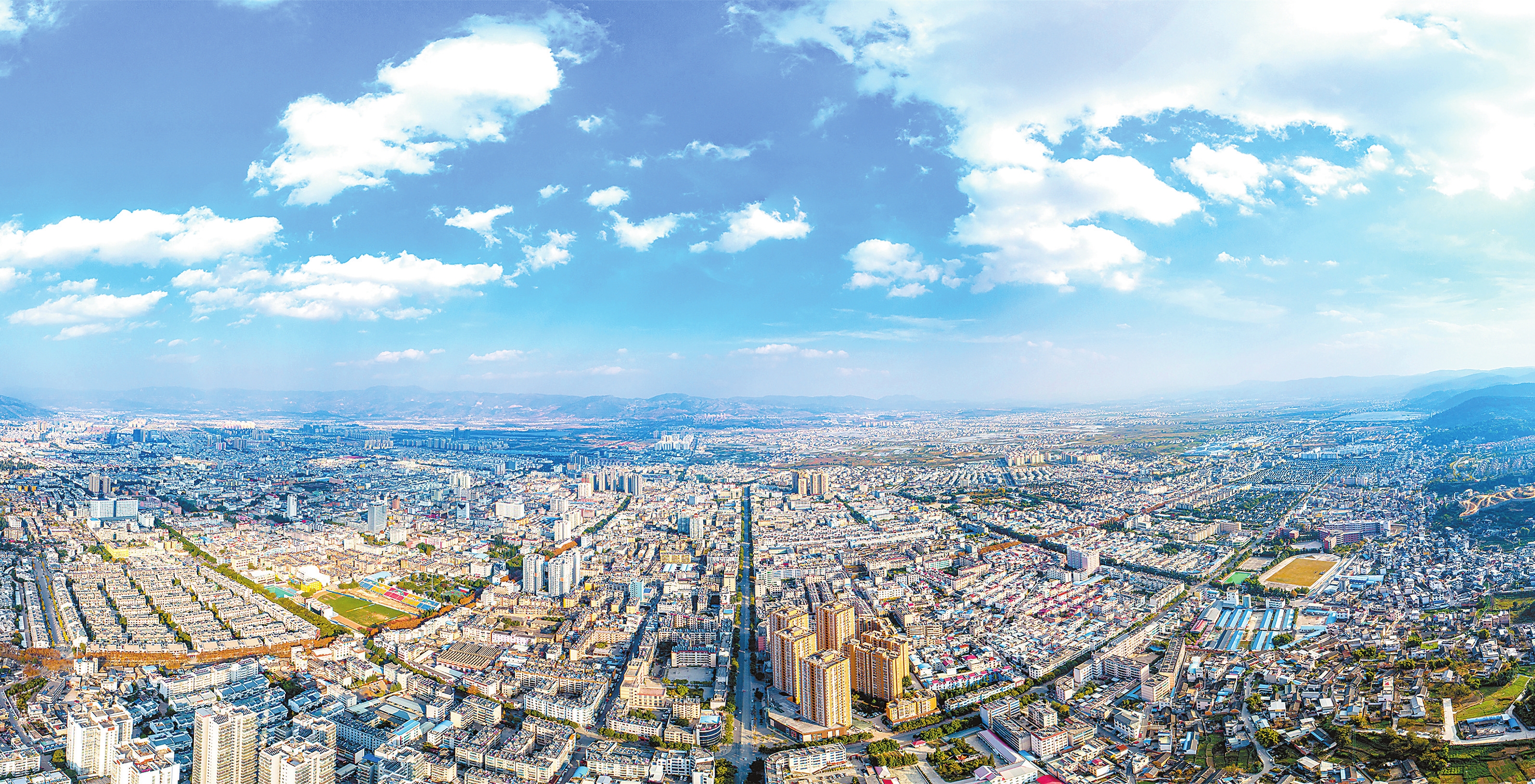 举目四望,田野上一片绿意盎然,庄稼地里玉米和烤烟蓬勃生长,盛放的荷花池旁是高低起伏白墙青瓦的村庄。远处的高速公路上,飞驰而来的车辆与古城遗址擦身而过,古今交织,时光交叠。