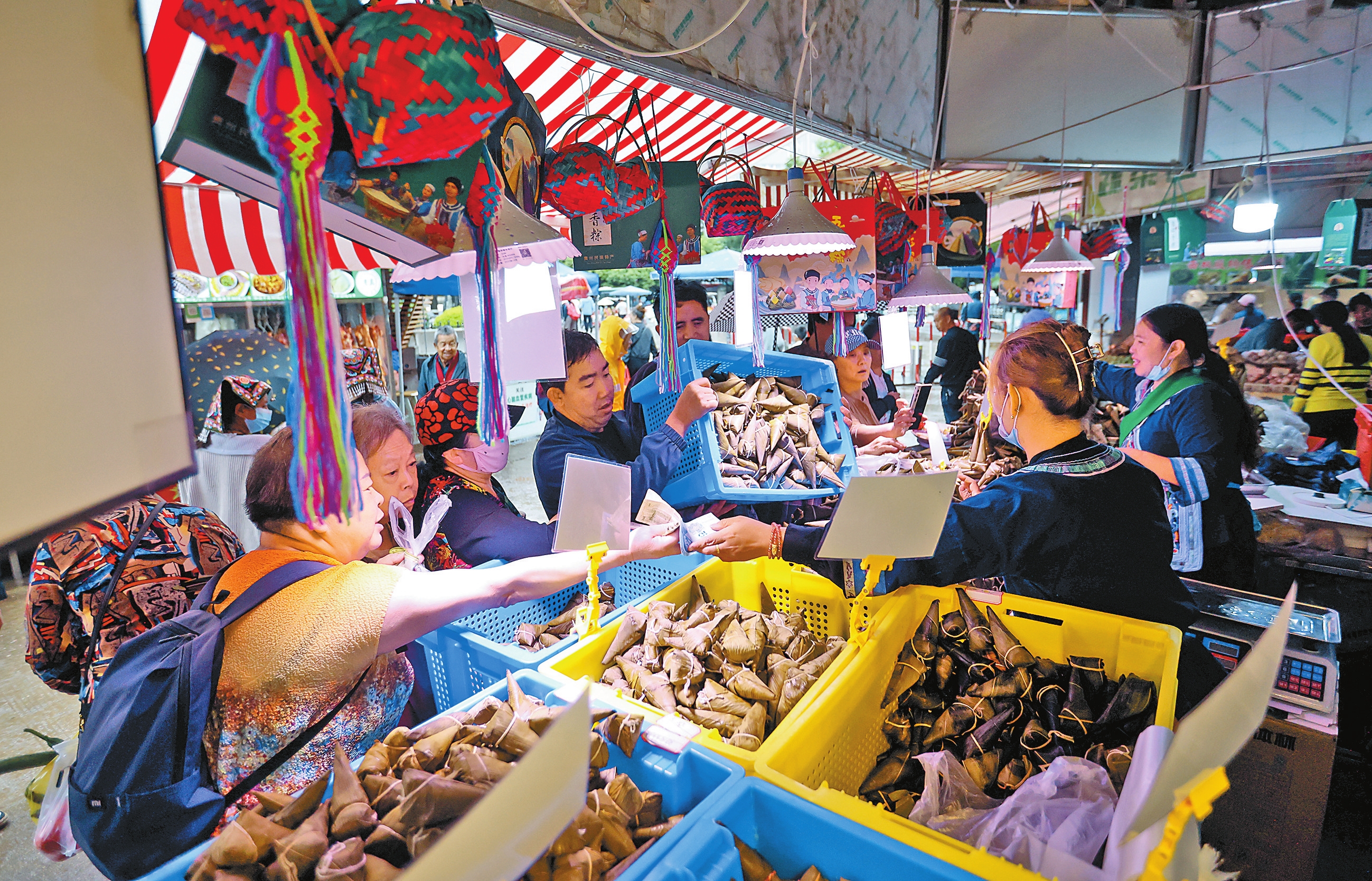 在河口瑶族自治县,5支银发志愿服务队中来自各行各业的职工群众展开包粽子比赛,热闹有趣的体验活动吸引许多居民和越南游客参与。
