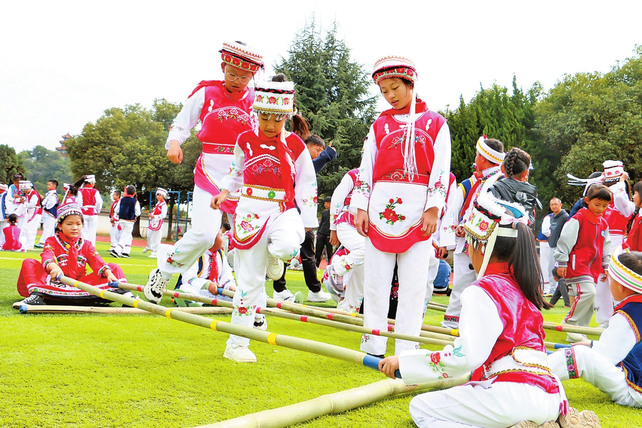 课间操是白族霸王鞭《金花花哟遍地开》,兴趣小组活动是白族扎染、竹竿舞、舞龙……近年来,昆明市西山区碧鸡街道观音山中心学校加强民族团结进步教育,铸牢中华民族共同体意识,先后获评云南省民族团结进步示范学校、云南省优秀民族文化教育示范学校。