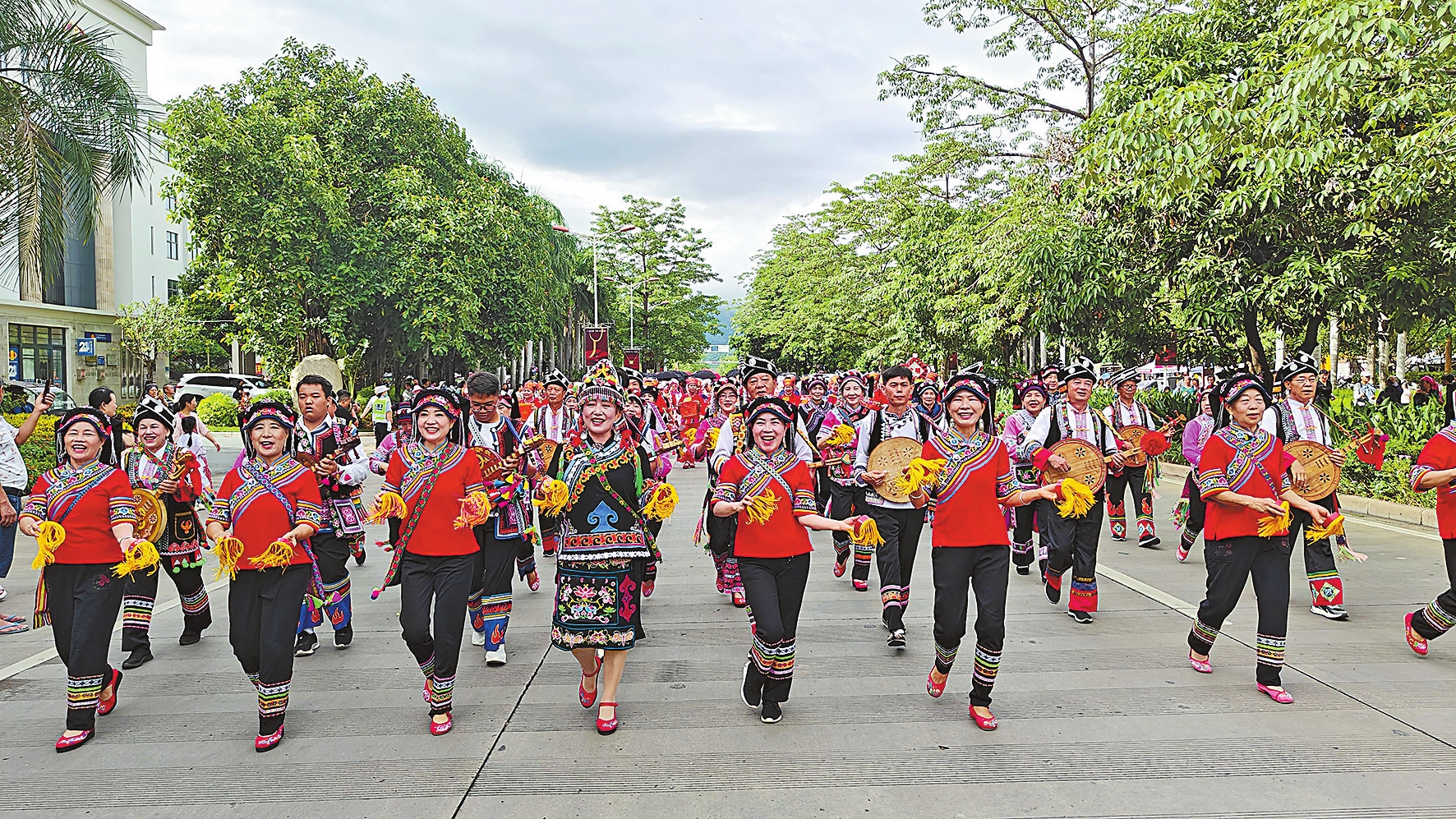 在元江县城,一场民族风情巡游大联欢让游客和群众充分感受到元江多姿多彩的非遗项目和民族文化。哈尼族、彝族、傣族、白族4个文化学会方队和10个乡镇(街道)代表组成的方队一路巡游展演,载歌载舞,在太阳城里刮起一股绚丽多彩的“民族风”。