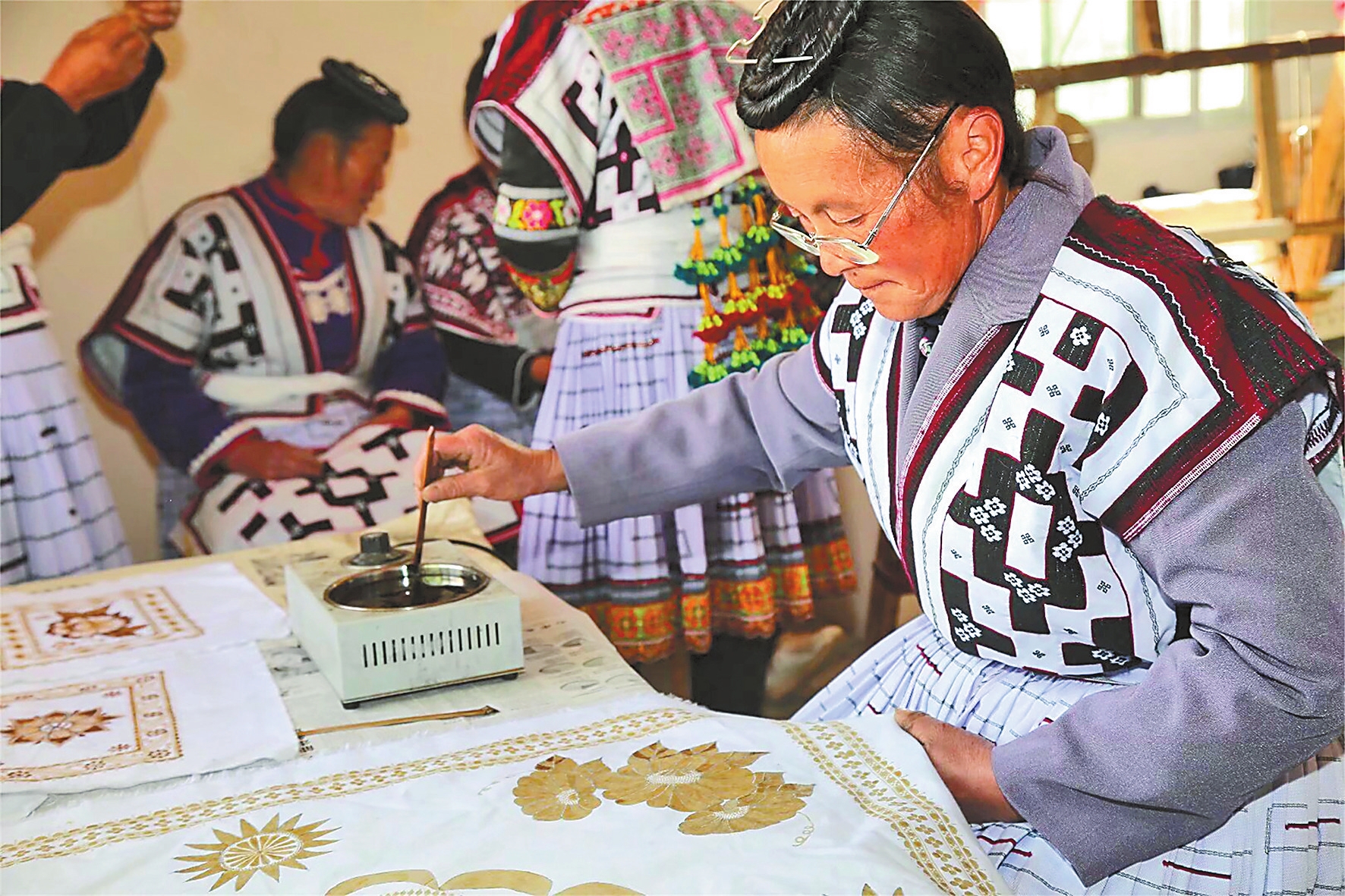苗族蜡染是一项传统的印染手工艺,在我国古代与扎染、镂空印花并称为“三大印花技艺”。在永善县马楠苗族彝族乡老铁厂、莲峰苗寨,苗族妇女以山水自然风光为灵感,融入民族文化元素,在天然纤维织物上点蜡绘图,表达对美好生活的憧憬。