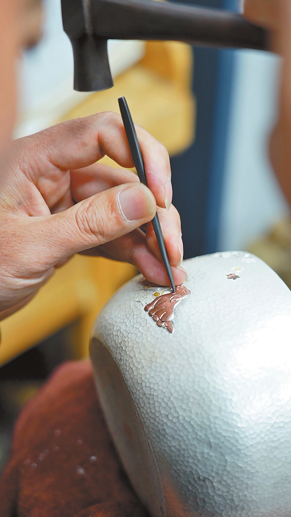 在“鹤庆银器锻制技艺”省级代表性传承人李耀华的工坊里,记者了解到一种将金、银、铜3种金属材料在镶嵌的基础之上錾刻出立体花纹的“镶錾”工艺。这门工艺是李耀华在传统“金银错”技艺的基础上开创的。结合自己擅长的“高浮雕錾刻”,李耀华錾刻的高浮雕牡丹,花瓣立体、做工细腻,一点黄金花蕊如画龙点睛,成为同行模仿的对象。
