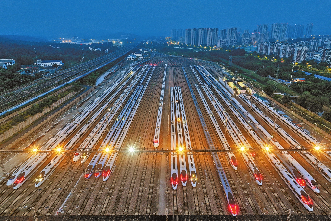 6月15日零时起,全国铁路将实行新的列车运行图。调图后,全国铁路安排图定旅客列车12690列,较现图增加205列;开行货物列车22595列,较现图增加74列。图为6月14日,动车停靠在南京动车段南京南动车运用所。 新华社发 方东旭 摄