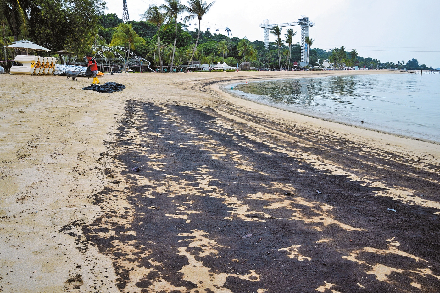 6月15日在新加坡圣淘沙岛拍摄的被污染的海滩。一艘挖泥船14日与一艘油料加注船在新加坡巴西班让码头相撞,导致石油泄漏,附近的旅游胜地圣淘沙岛海滩受到污染。新华社发 邓智炜 摄
