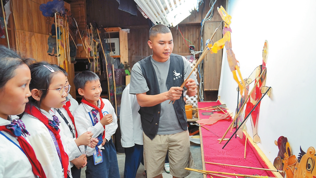 日前,腾冲市委文明办、市教育体育局组织腾冲市实验学校的部分小学生,到腾冲非遗文创街区开展“保护文化遗产 传承中华文明”文明实践活动。图为学生观看腾冲皮影戏表演。本报记者 李建国 通讯员 张世东 摄