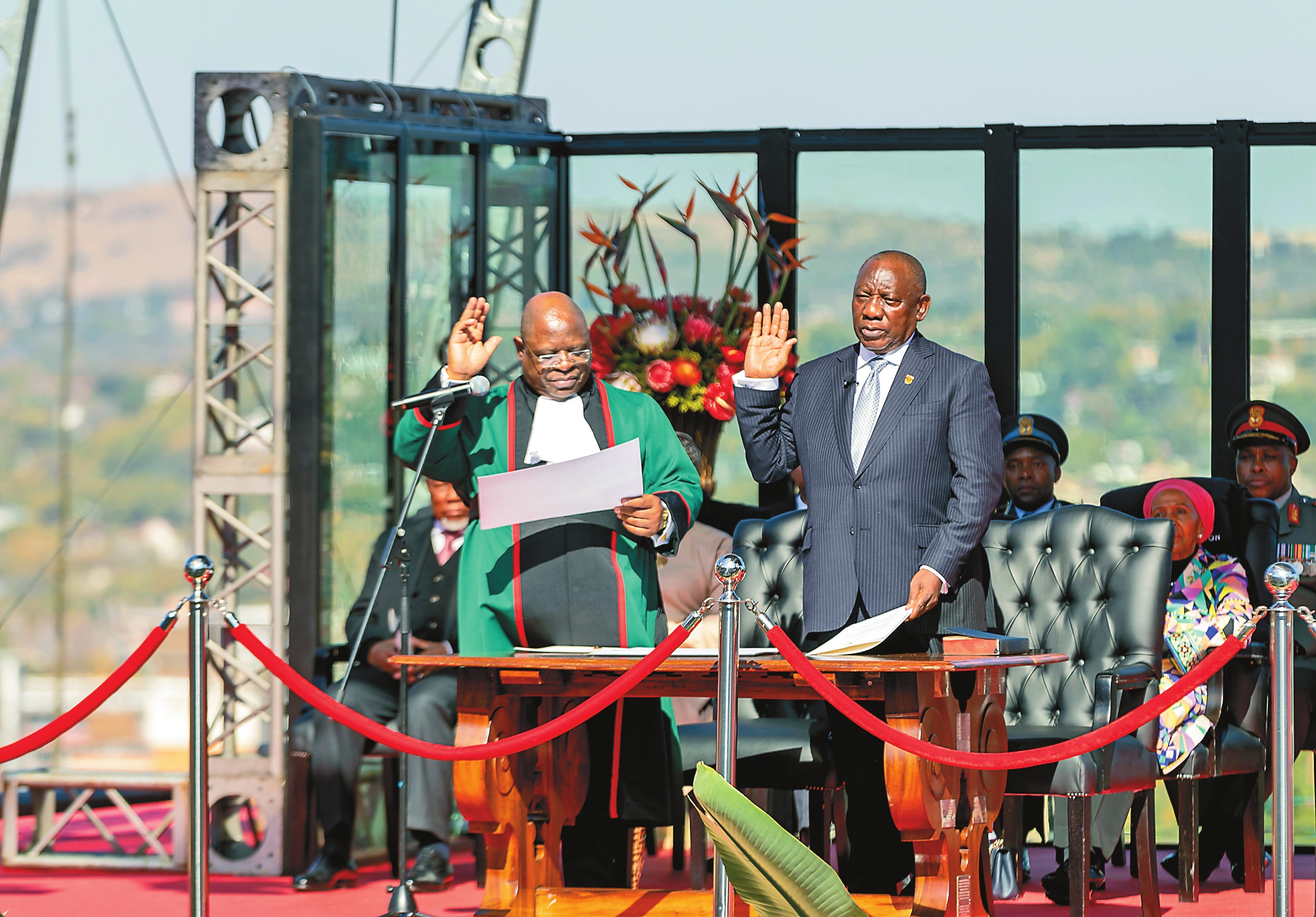 图为6月19日,在南非比勒陀利亚联邦大厦,南非新任总统西里尔·拉马福萨(右)宣誓就职。