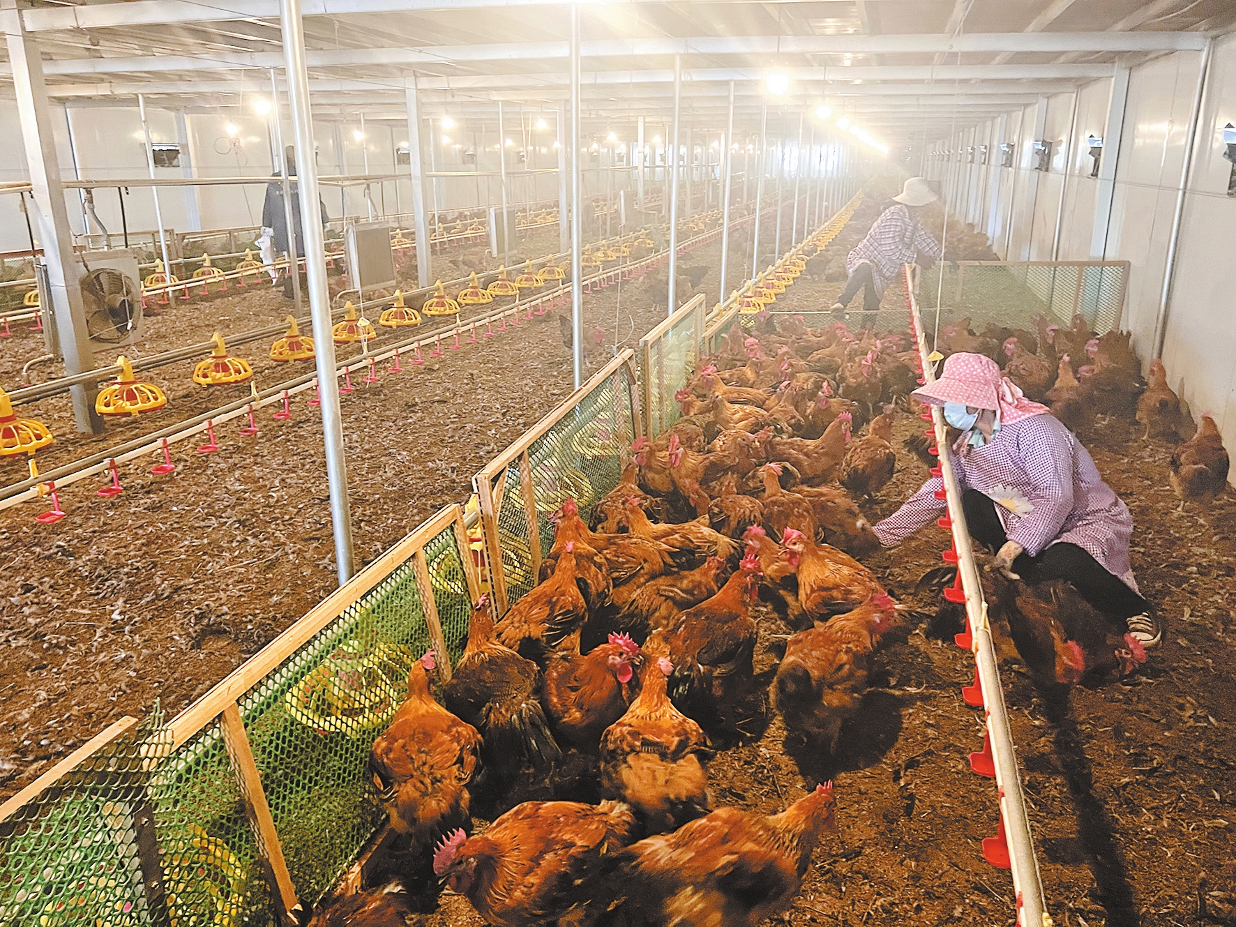 “鸡舍配备了远程视频监管、仓储管理系统、种植养殖循环实验区、孵化机、脱温架、层叠式蛋鸡笼、自动喂料饮水机、自动捡蛋机、温控系统消毒设备、全彩智能侦测摄像机等。”管理人员介绍,在东村祖库山地鸡养殖示范基地,4栋双层现代化鸡舍养殖了9万羽山地鸡。