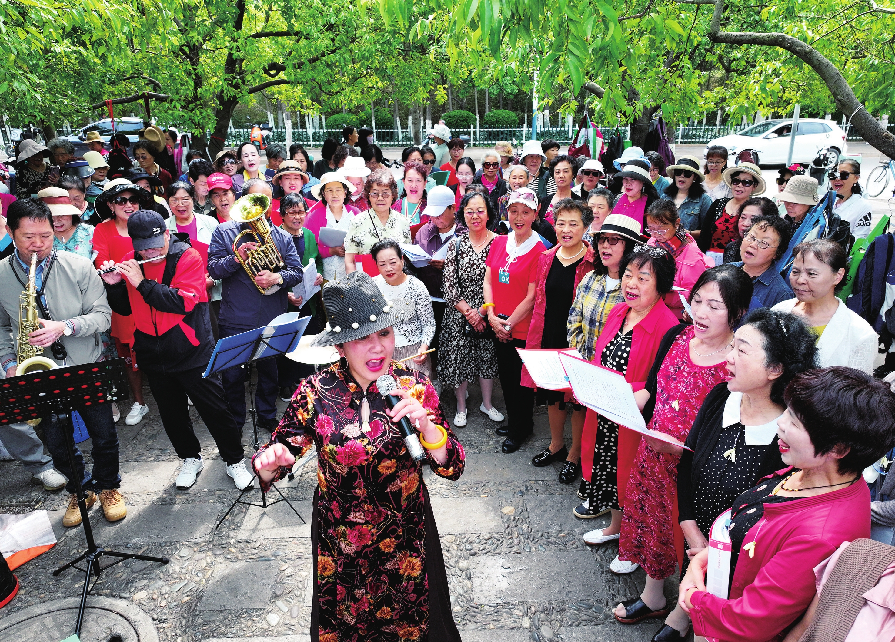 乐团名为“军旅艺术团”,艺术团里有合唱团、管乐团、舞蹈团,团员近500人。团长叫李淑芬,她和艺术团里大多数成员一样,曾经是部队里的文艺工作者,因为热爱音乐,退役后又再度相聚。乐团成员年龄最小的50岁,最大的有87岁。“虽然平时只是聚在一起唱唱歌,但我们风雨无阻,雨天打着伞也唱。”团员杨蕊说。