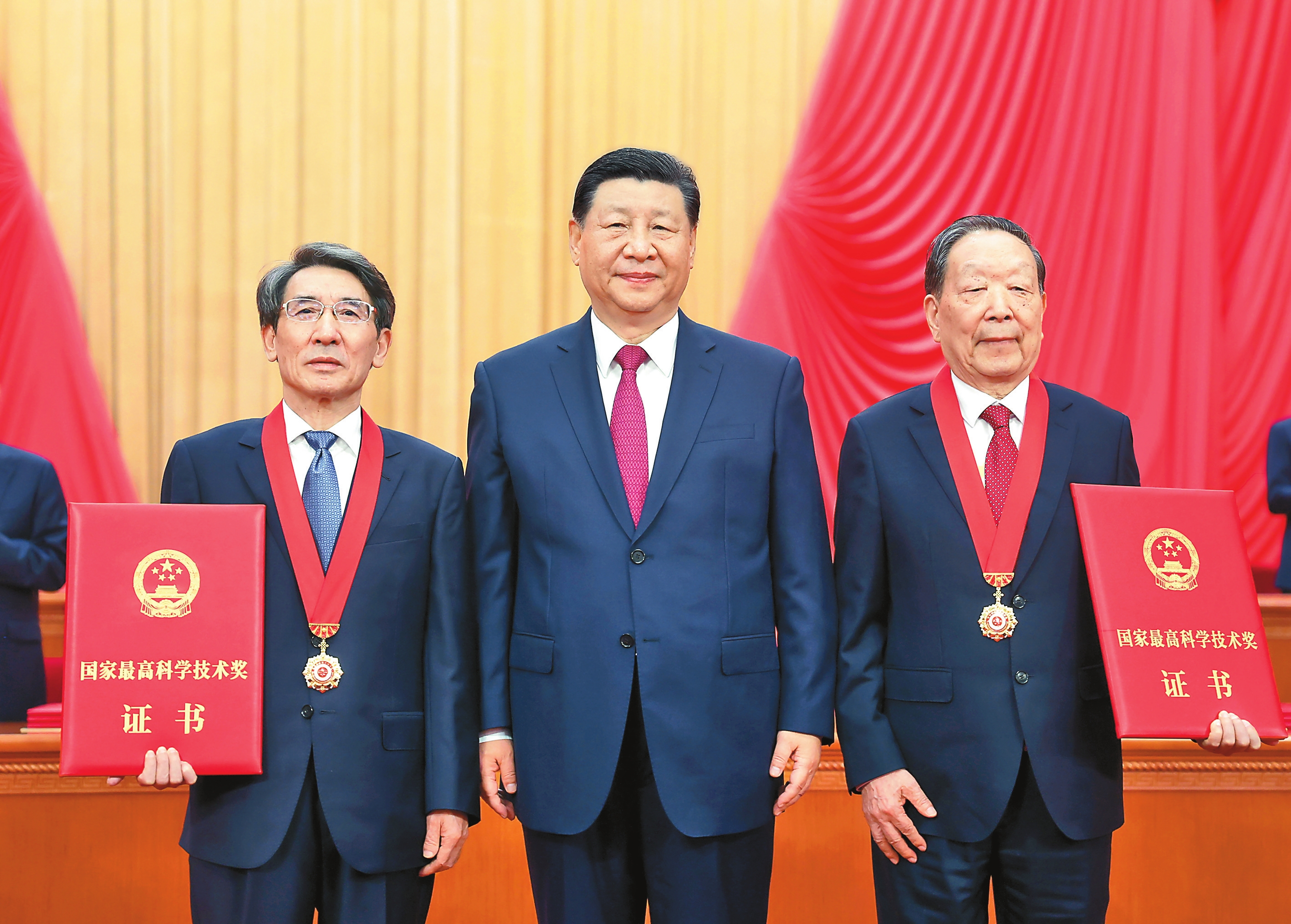 六月二十四日,全国科技大会、国家科学技术奖励大会和中国科学院第二十一次院士大会、中国工程院第十七次院士大会在北京人民大会堂隆重召开。中共中央总书记、国家主席、中央军委主席习近平向获得二○二三年度国家最高科学技术奖的武汉大学李德仁院士(右)和清华大学薛其坤院士(左)颁奖。新华社记者 鞠鹏 摄